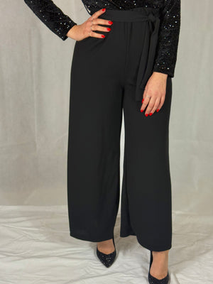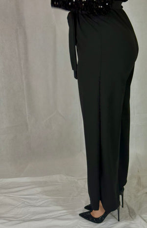La parte superiore è impreziosita da paillettes luminose che donano luce e raffinatezza al capo, mentre la cintura in vita definisce la silhouette valorizzando le forme. La linea scende armoniosa, creando un equilibrio tra eleganza e comfort.