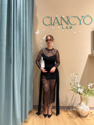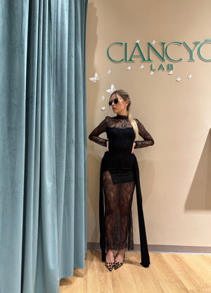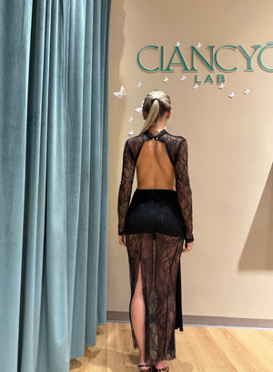 Questo abito nero lungo, impreziosito da raffinati inserti in pizzo, lascia la schiena scoperta ma delicatamente coperta sulle spalle per un effetto sofisticato.