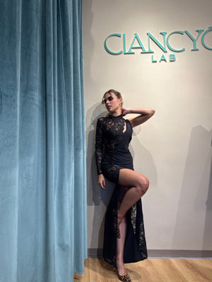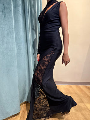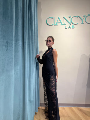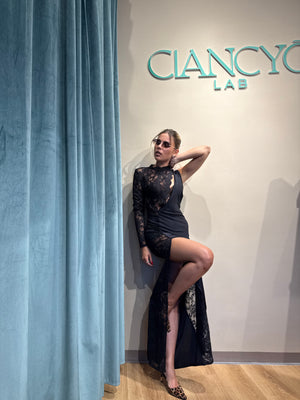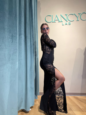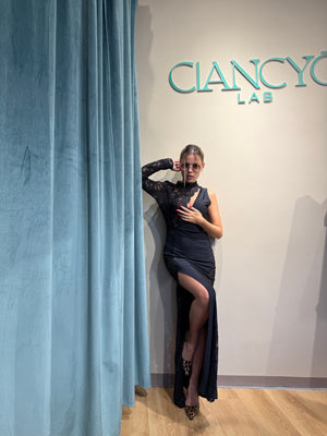 Abito Nikla è un capo lungo e seducente, impreziosito da uno spacco laterale sulla gamba destra che ne esalta l’eleganza e la sensualità.