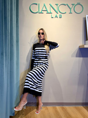 Svela la tua audacia con l’Abito Soledad, un lungo vestito a strisce che cattura lo sguardo e sfida le convenzioni.