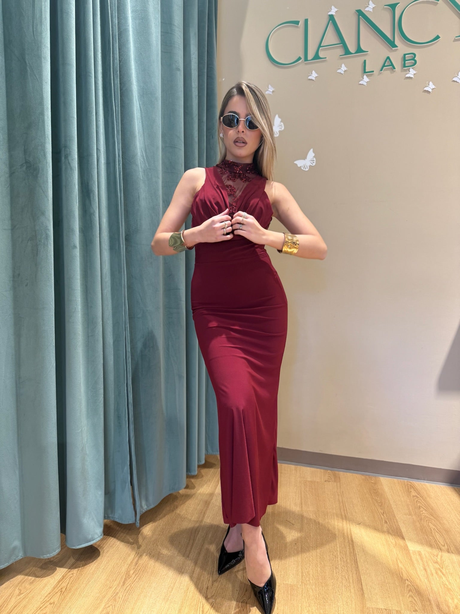 Un abito lungo realizzato in satinato lucido, morbido e avvolgente, che scivola sulla silhouette con naturale eleganza.