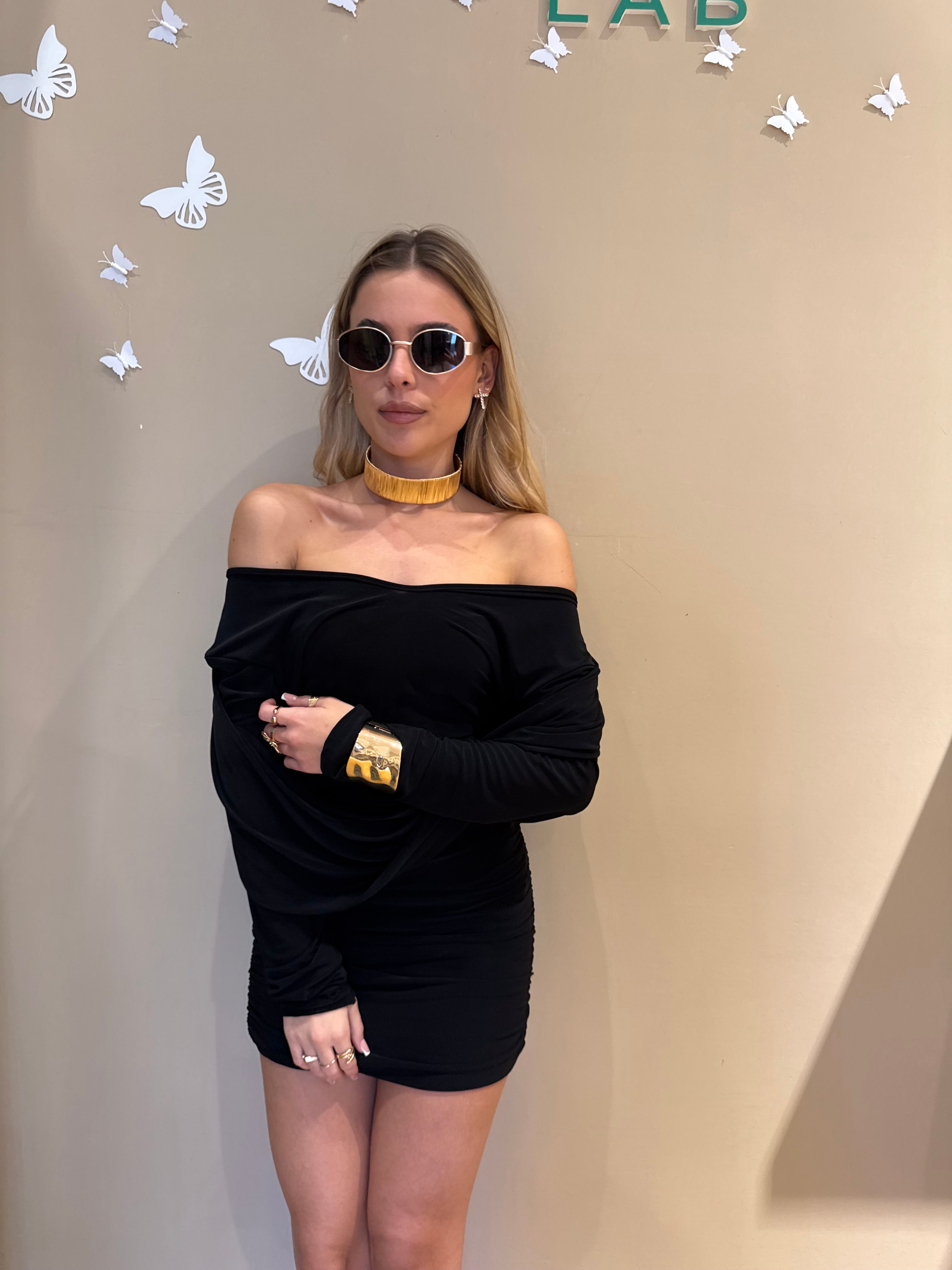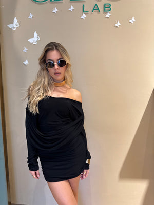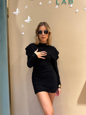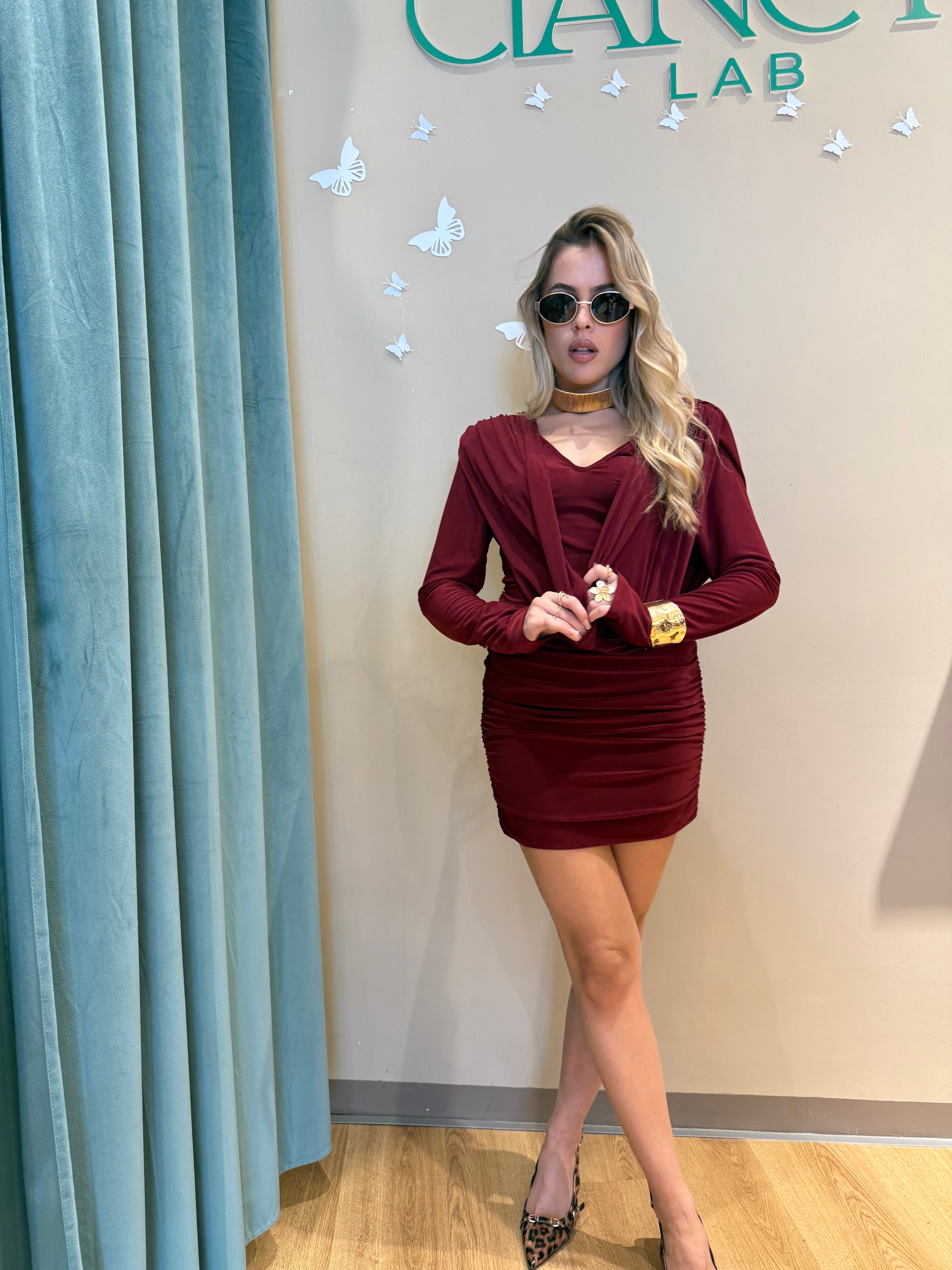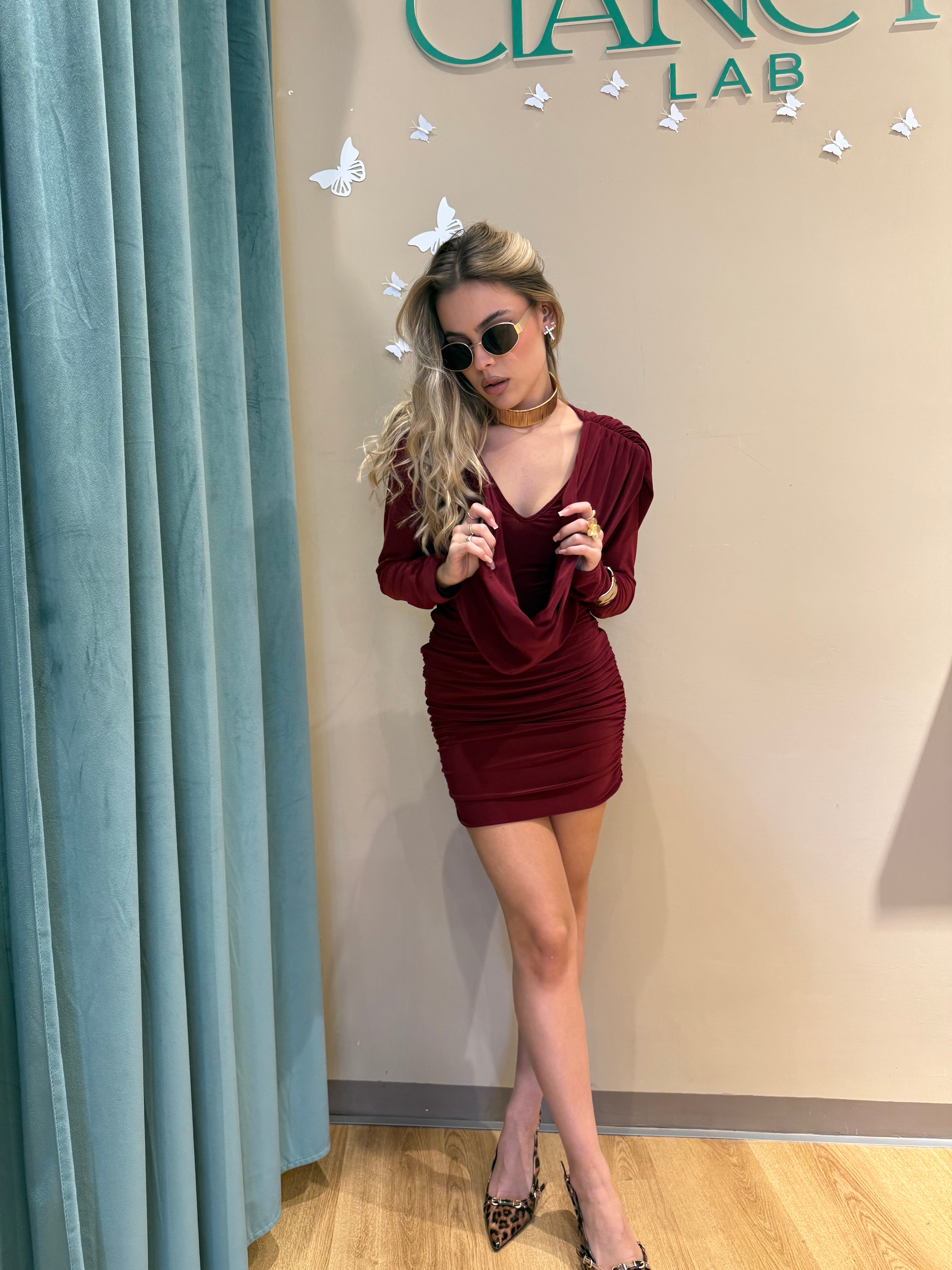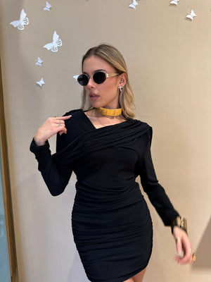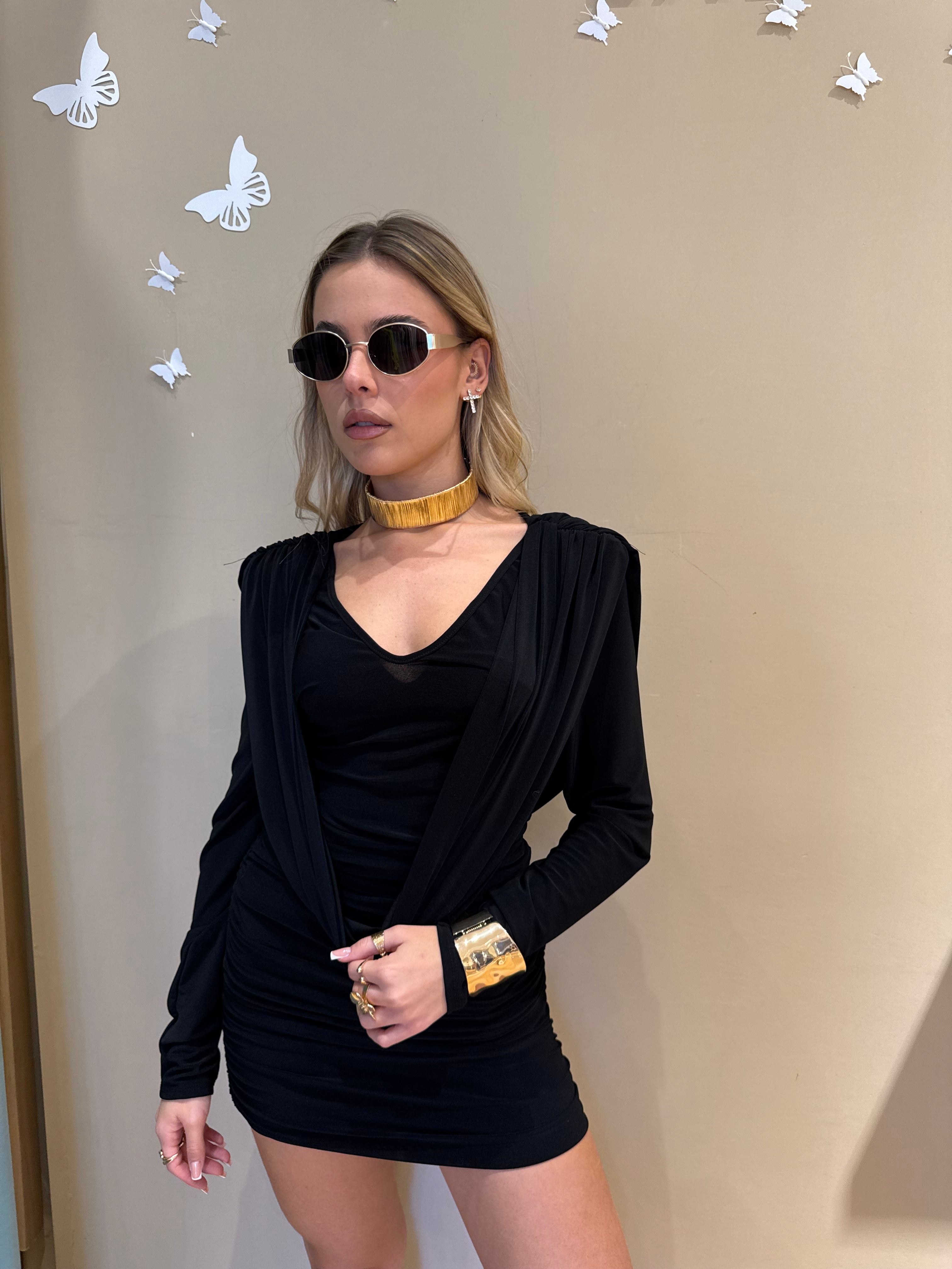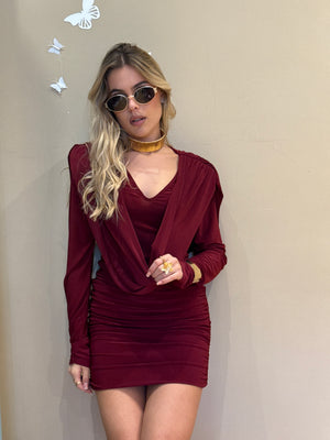 Il suo drappeggio profondo sul décolleté e le arricciature laterali creano un effetto silhouette slanciato e super femminile, mentre le maniche lunghe e la linea corta lo rendono ideale per un look da sera moderno e raffinato.