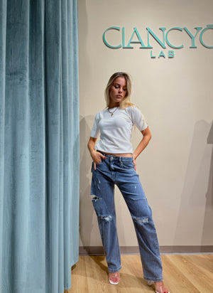 I Jeans Rebel sono un capo dallo stile deciso, caratterizzati da una silhouette a gamba palazzo dritta che valorizza la figura con comodità.