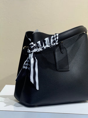 La BAG BOXY ✨ è una borsa a secchiello versatile, dotata di manico avvolto in un elegante foulard e di una tracolla regolabile per un comfort personalizzato.
