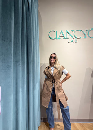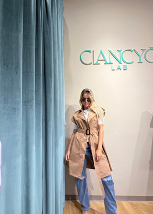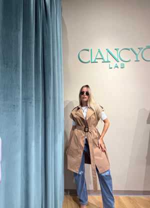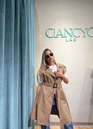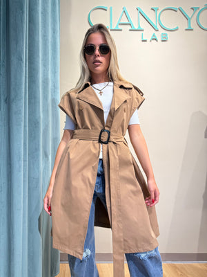 Il trench smanicato CORALINE unisce stile e funzionalità con tasche laterali pratiche e cintura in vita arricchita da un dettaglio centrale raffinato.