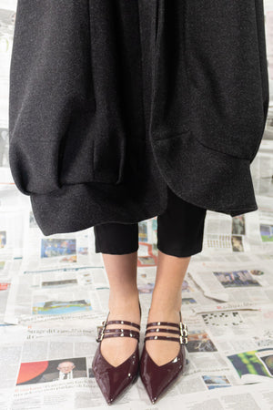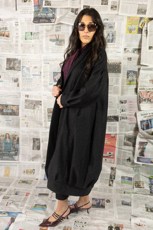 Cappotto lungo modello ballon fino alla caviglia, foderato internamente per garantire calore e comfort.