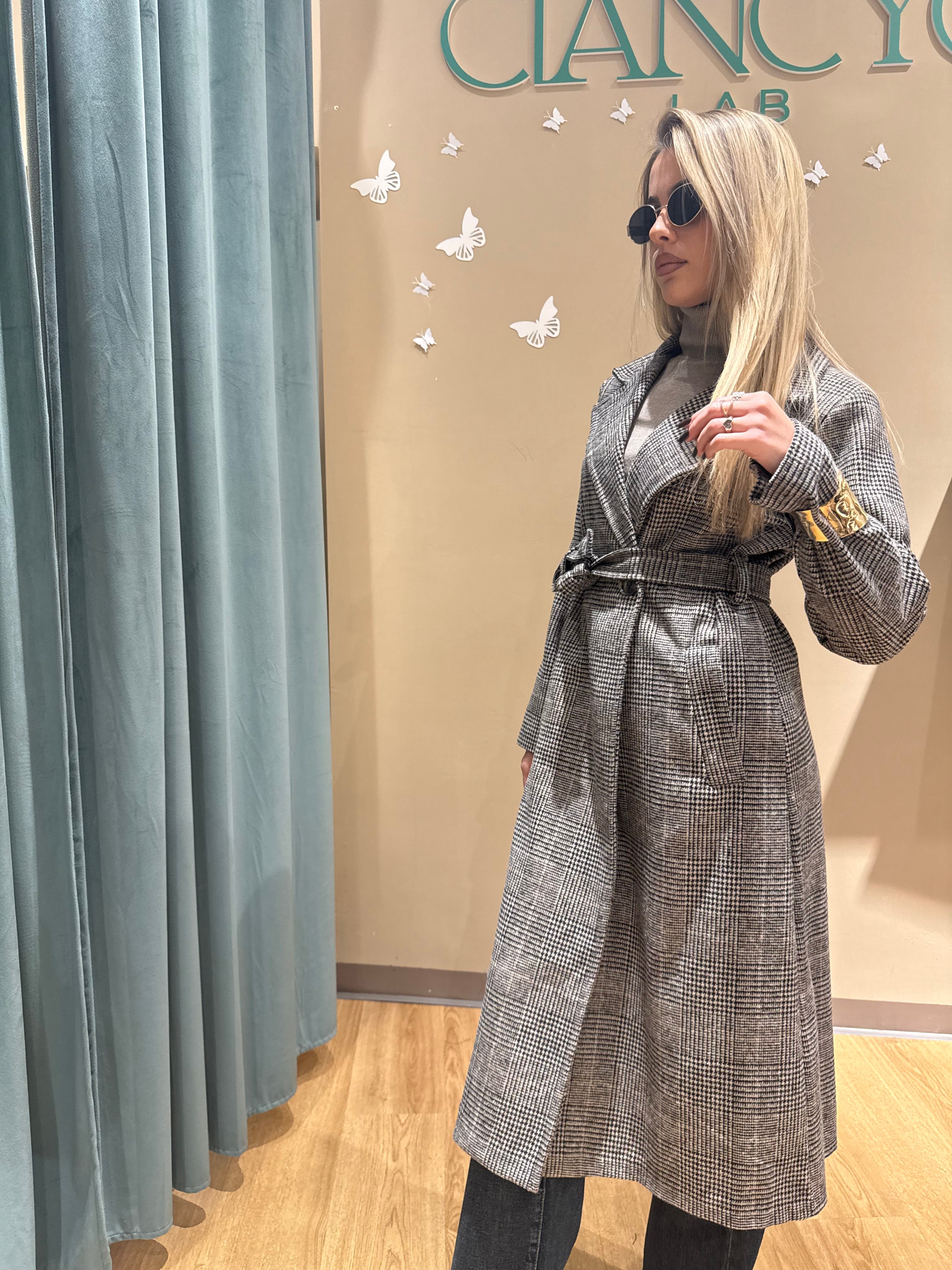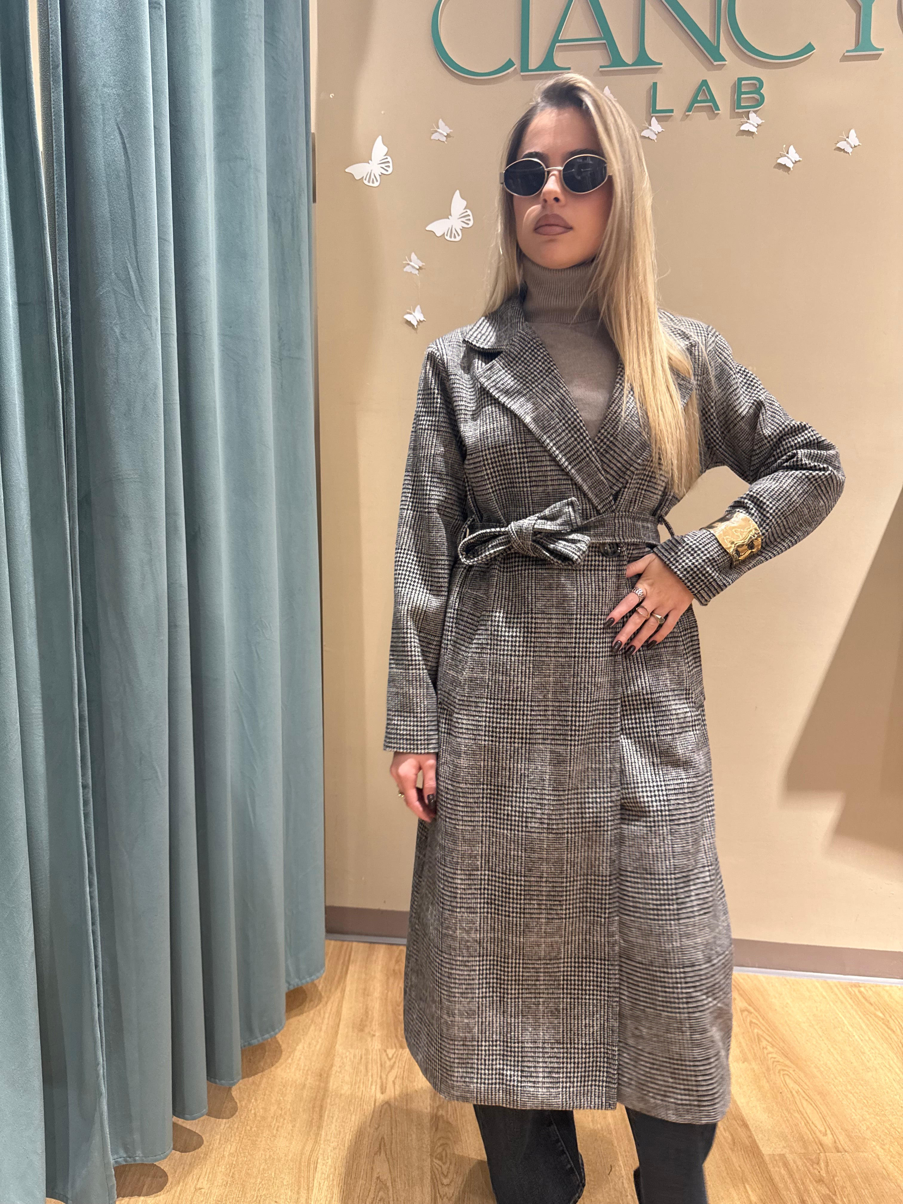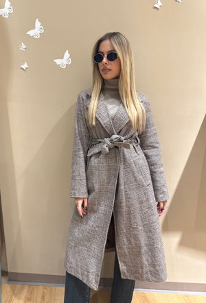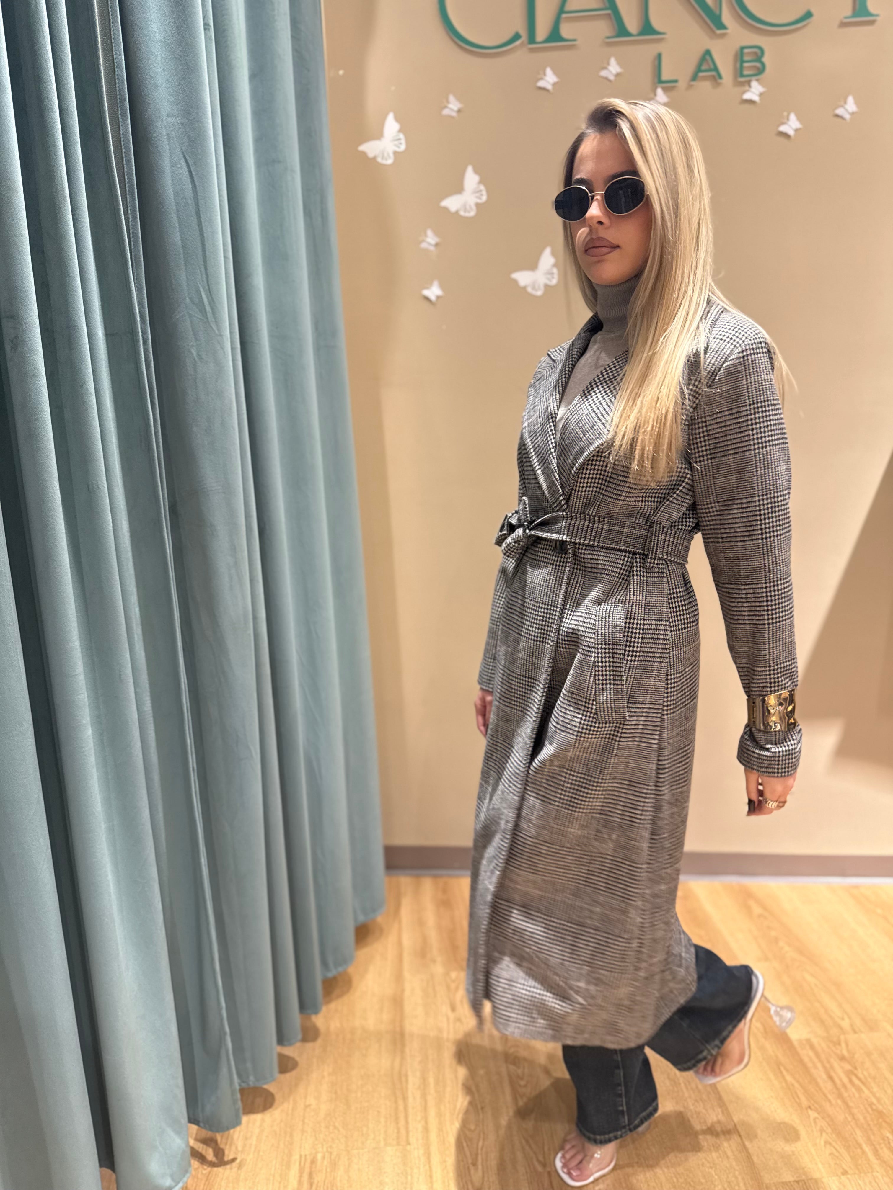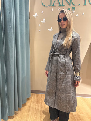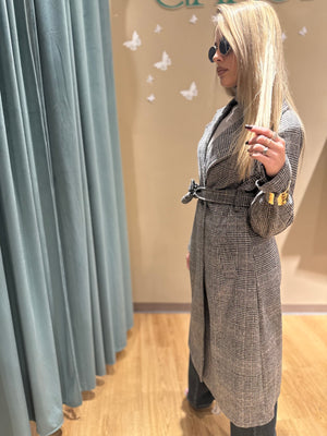 Il suo design doppio petto e la cintura in vita disegnano una silhouette femminile e raffinata, mentre il taglio lungo sotto il ginocchio dona eleganza e slancio naturale.