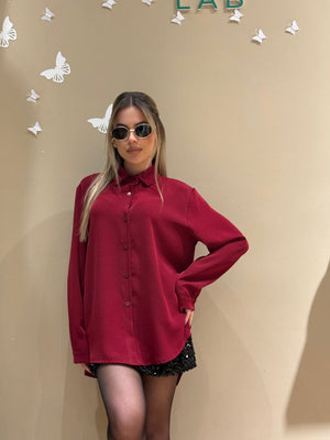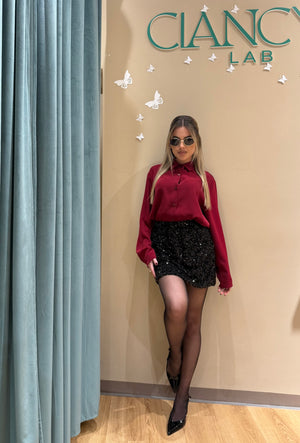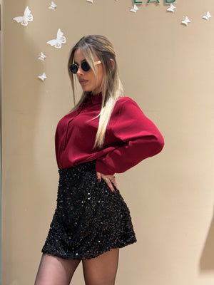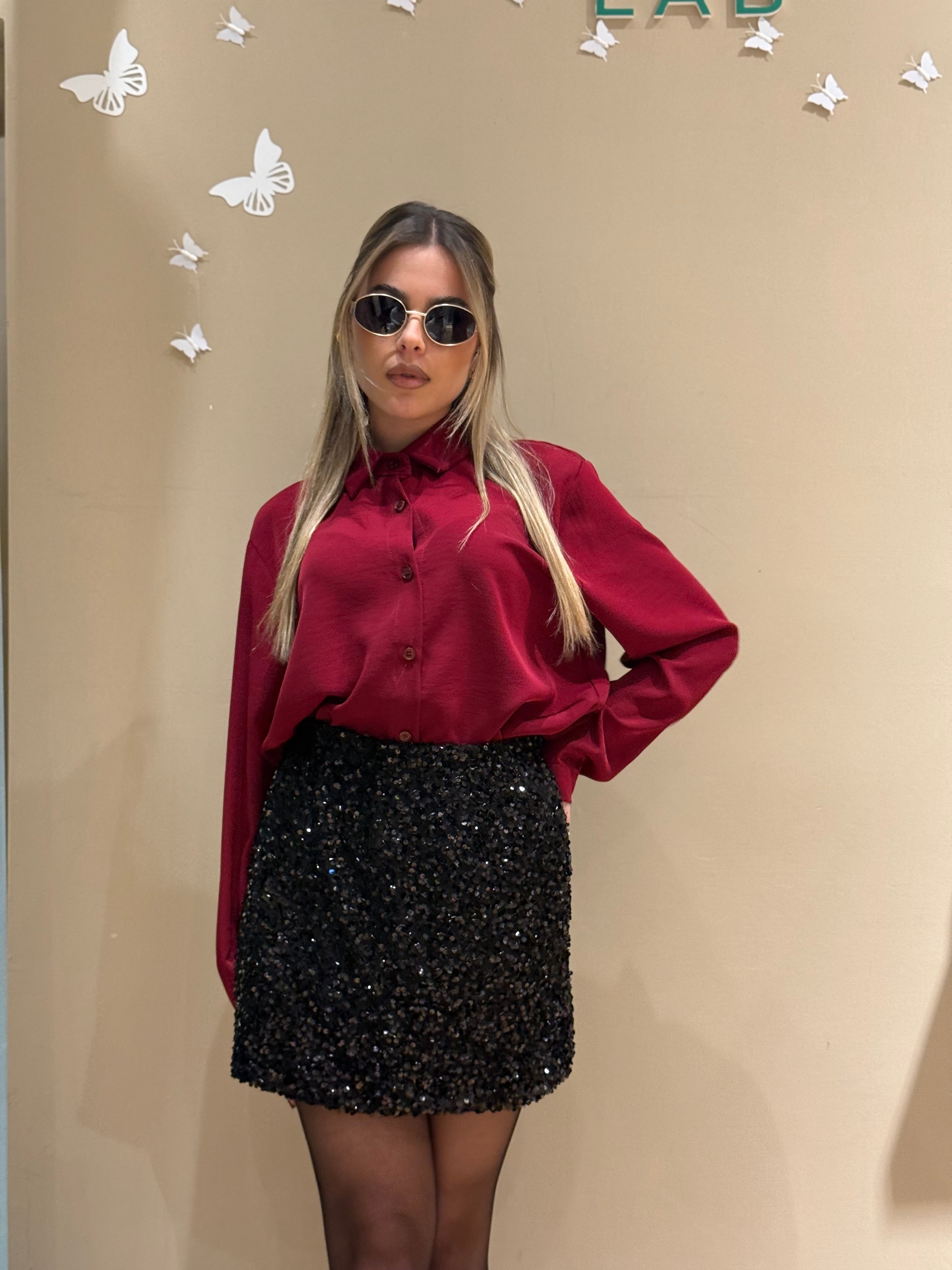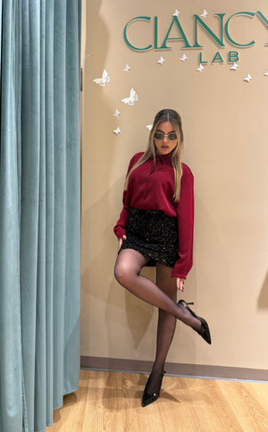 La camicia bordeaux in raso morbido scivola sulla pelle con un effetto lucido raffinato, mentre la gonna midi nera interamente ricoperta di paillettes cattura la luce ad ogni movimento, regalando un look sofisticato e glamour.
