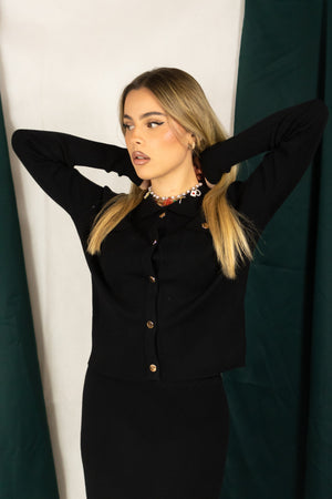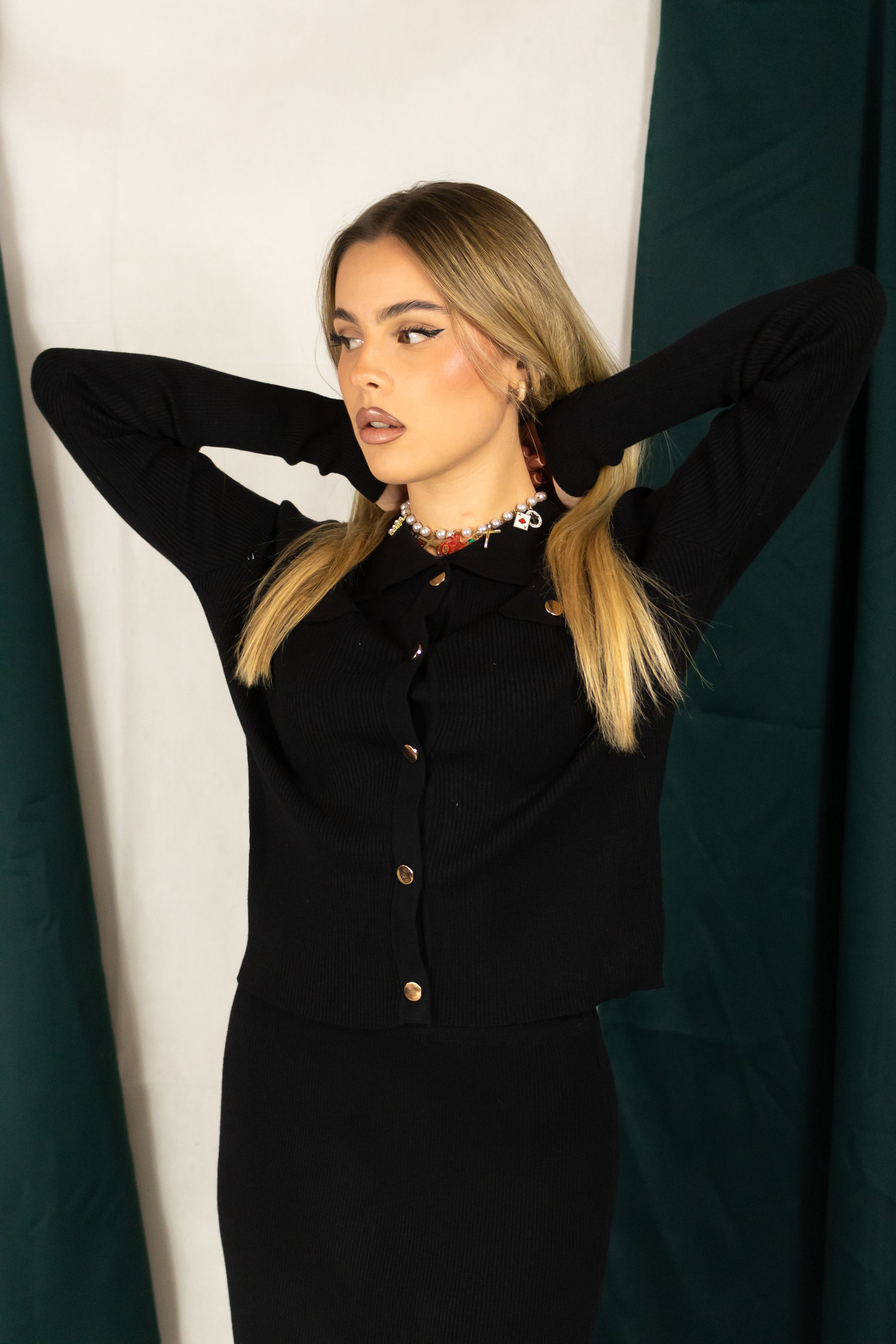 Coordinato elegante e super femminile composto da gonna longuette e golfino cardigan abbinato.