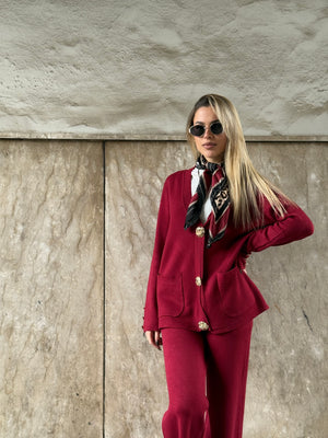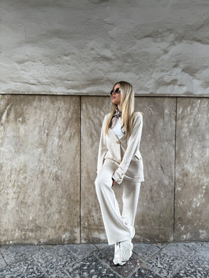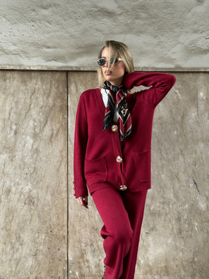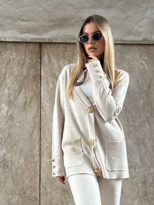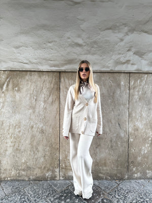Il cardigan è impreziosito da bottoni gioiello a clip, che lo trasformano subito in un vero must-have, mentre il pantalone morbido garantisce una vestibilità comoda e versatile.
