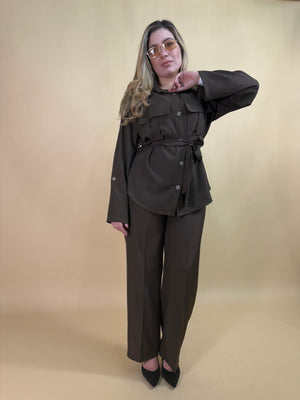 La giacca camicia completa il look con stile: due tasche frontali pratiche e bottoni marrone effetto noce a contrasto aggiungono carattere e raffinatezza.