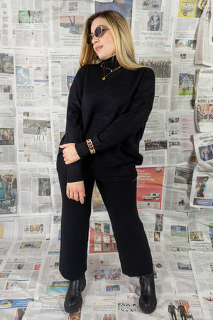 Coordinato composto da maglia con collo e lunghezza leggermente più estesa, dal taglio confortevole e moderno, abbinata a pantalone a gamba dritta che dona equilibrio e versatilità al look. Un completo pratico ma curato, ideale per chi cerca uno stile raffinato senza rinunciare alla comodità, perfetto sia per il giorno che per il tempo libero.