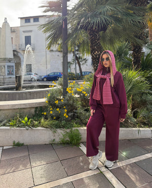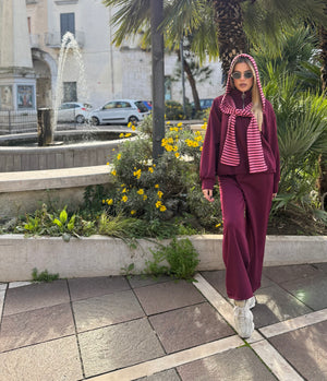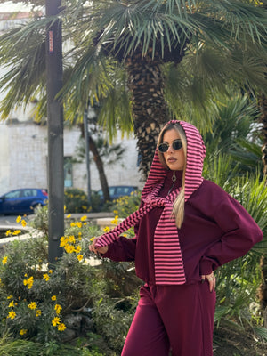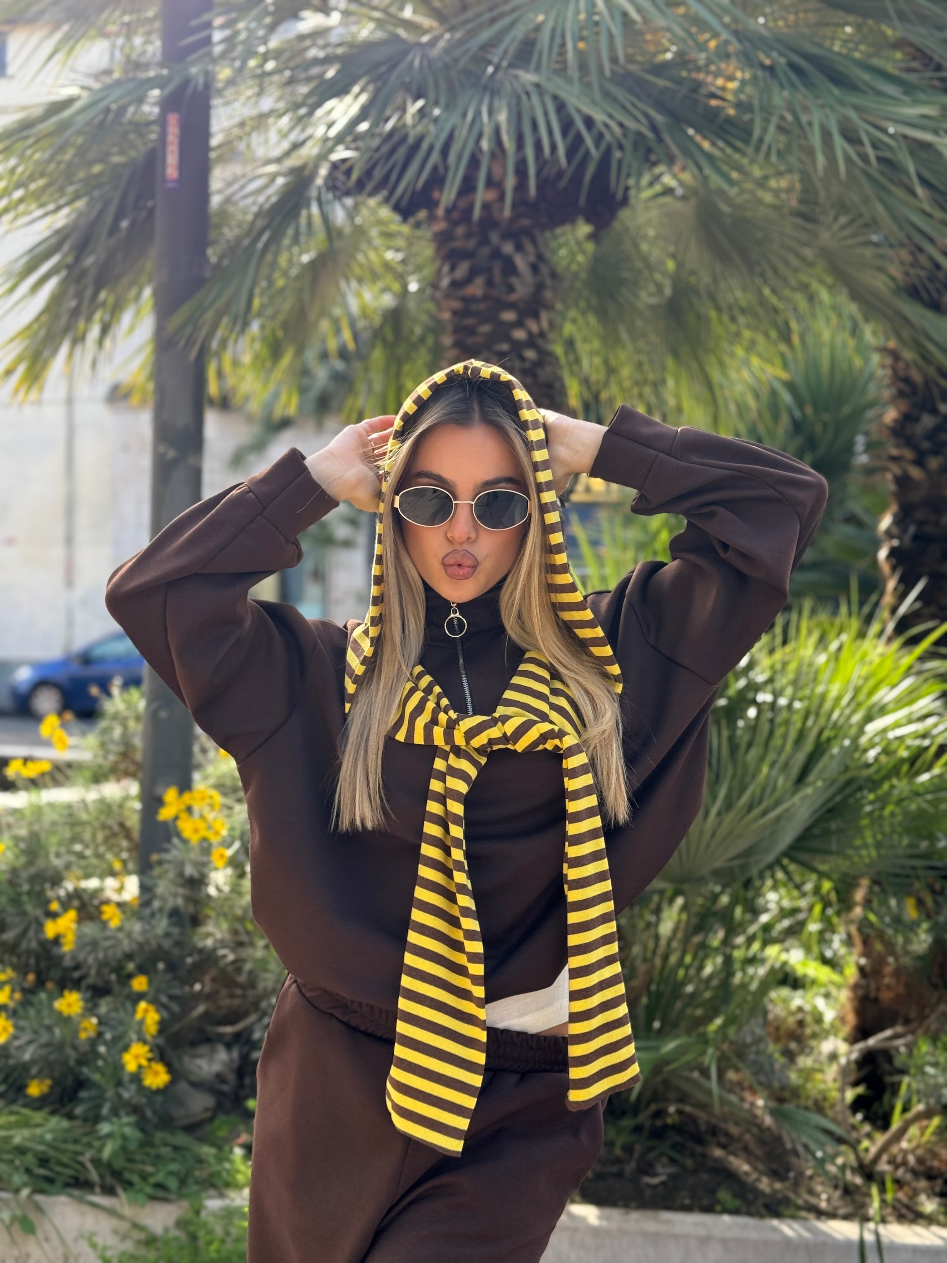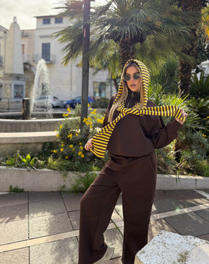 La felpa, altrettanto soffice, è caratterizzata da un cappuccio con righe che scende come una sciarpa, richiamando uno dei dettagli più visti e amati sui social.