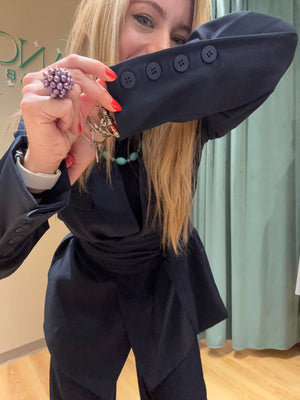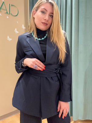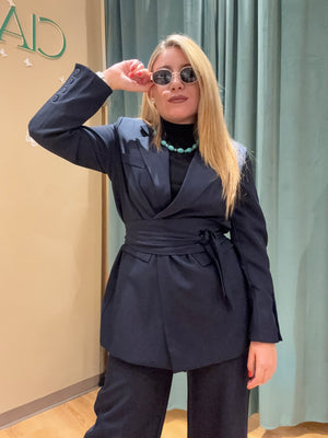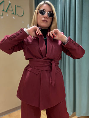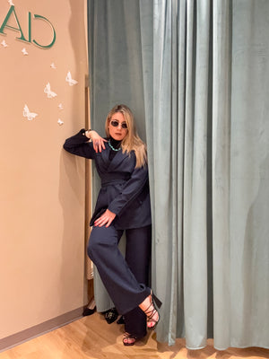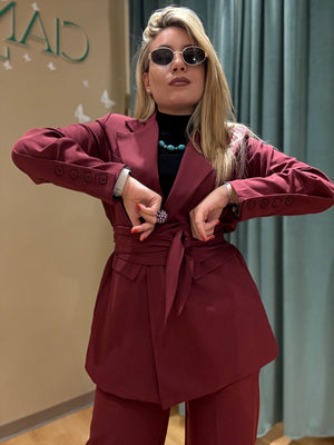 Il Tailleur Priscilla è composto da un pantalone a gamba dritta e una giacca monopetto con abbottonatura centrale, arricchito da una fusciacca in vita.