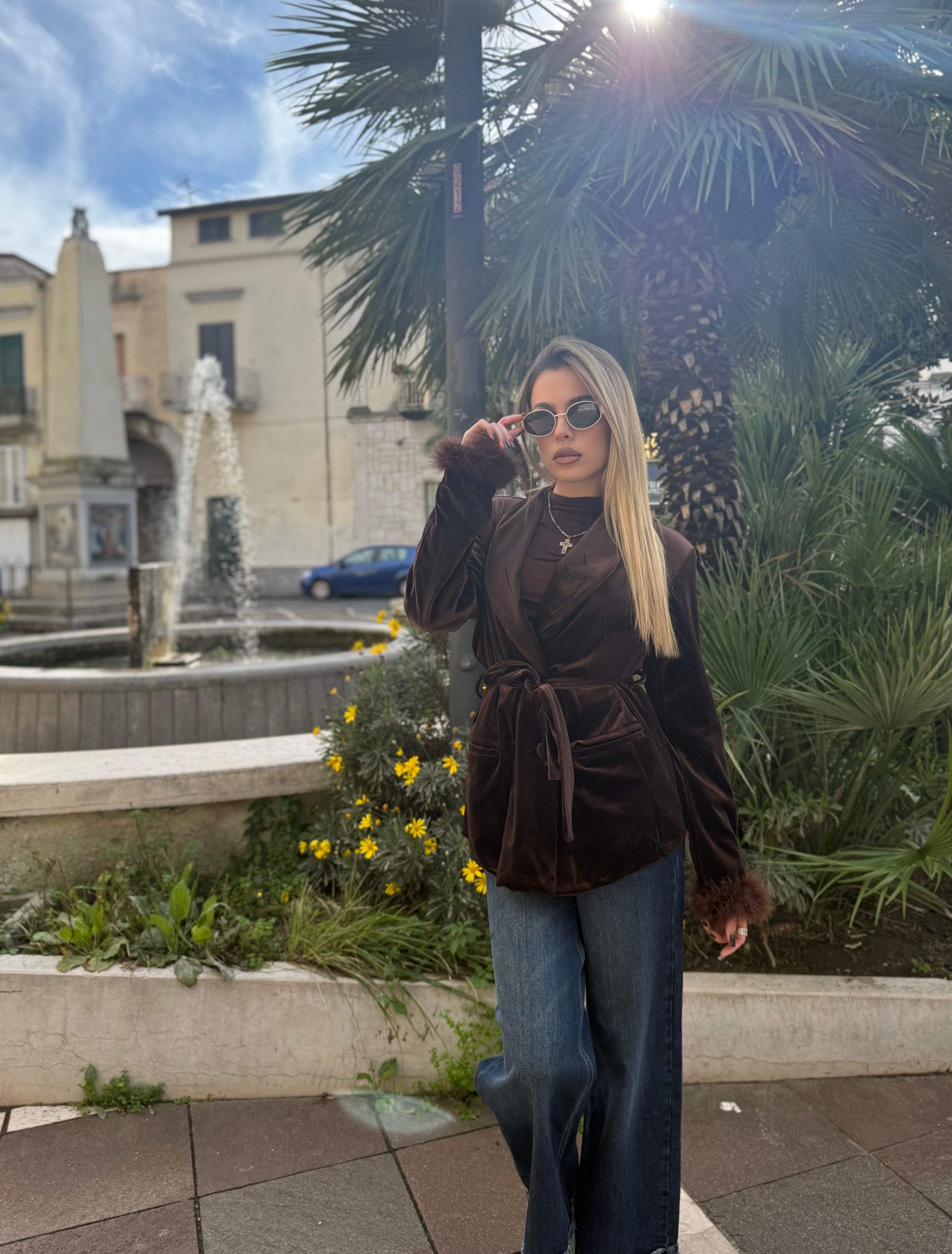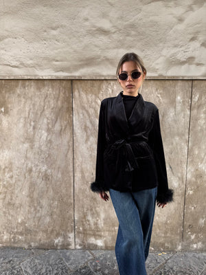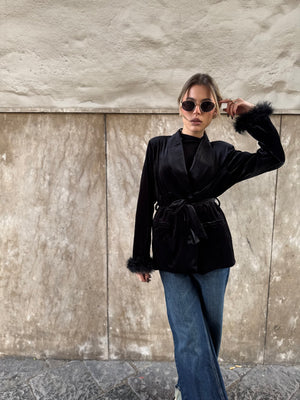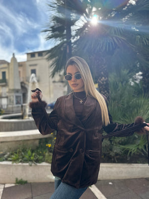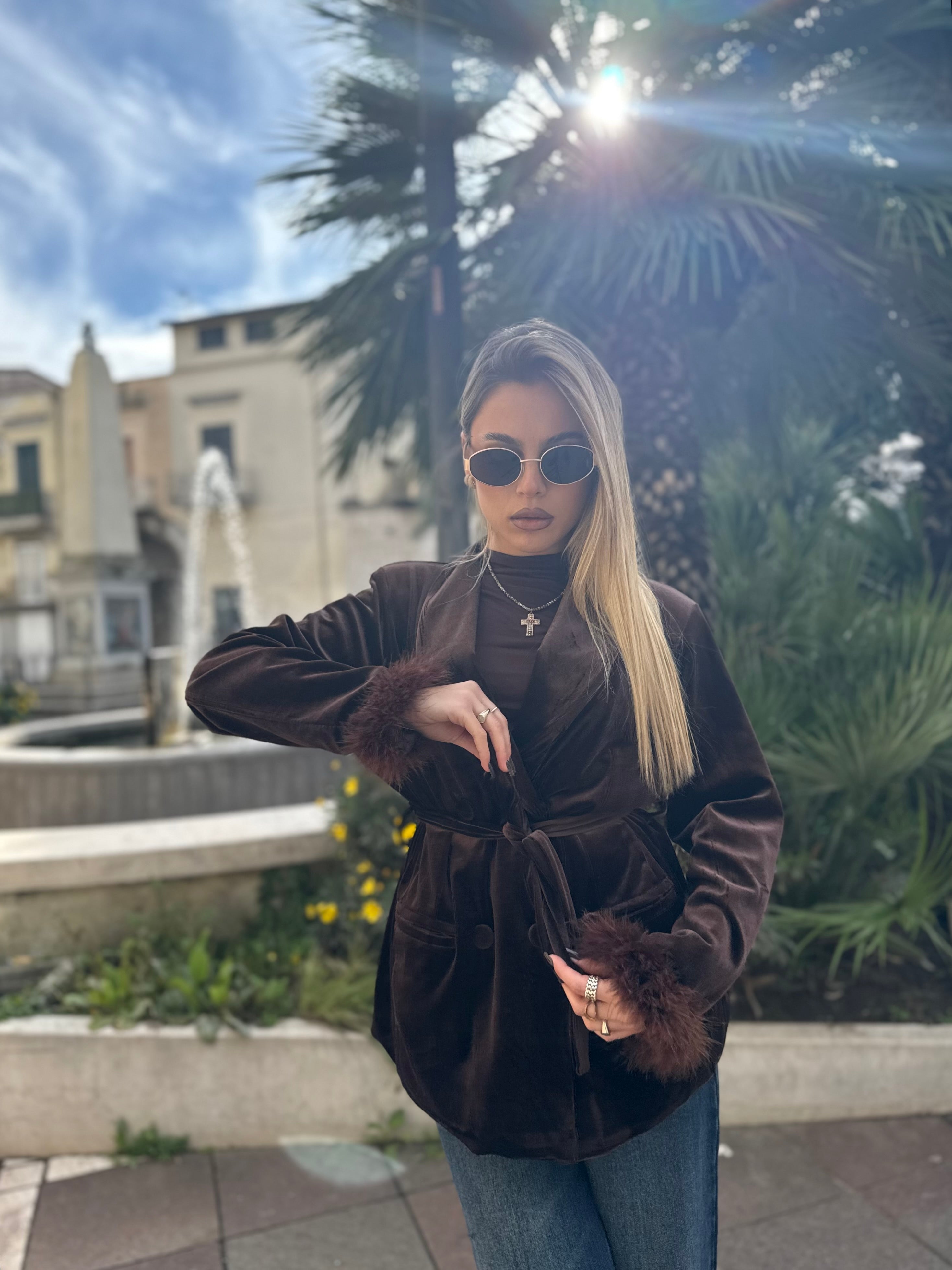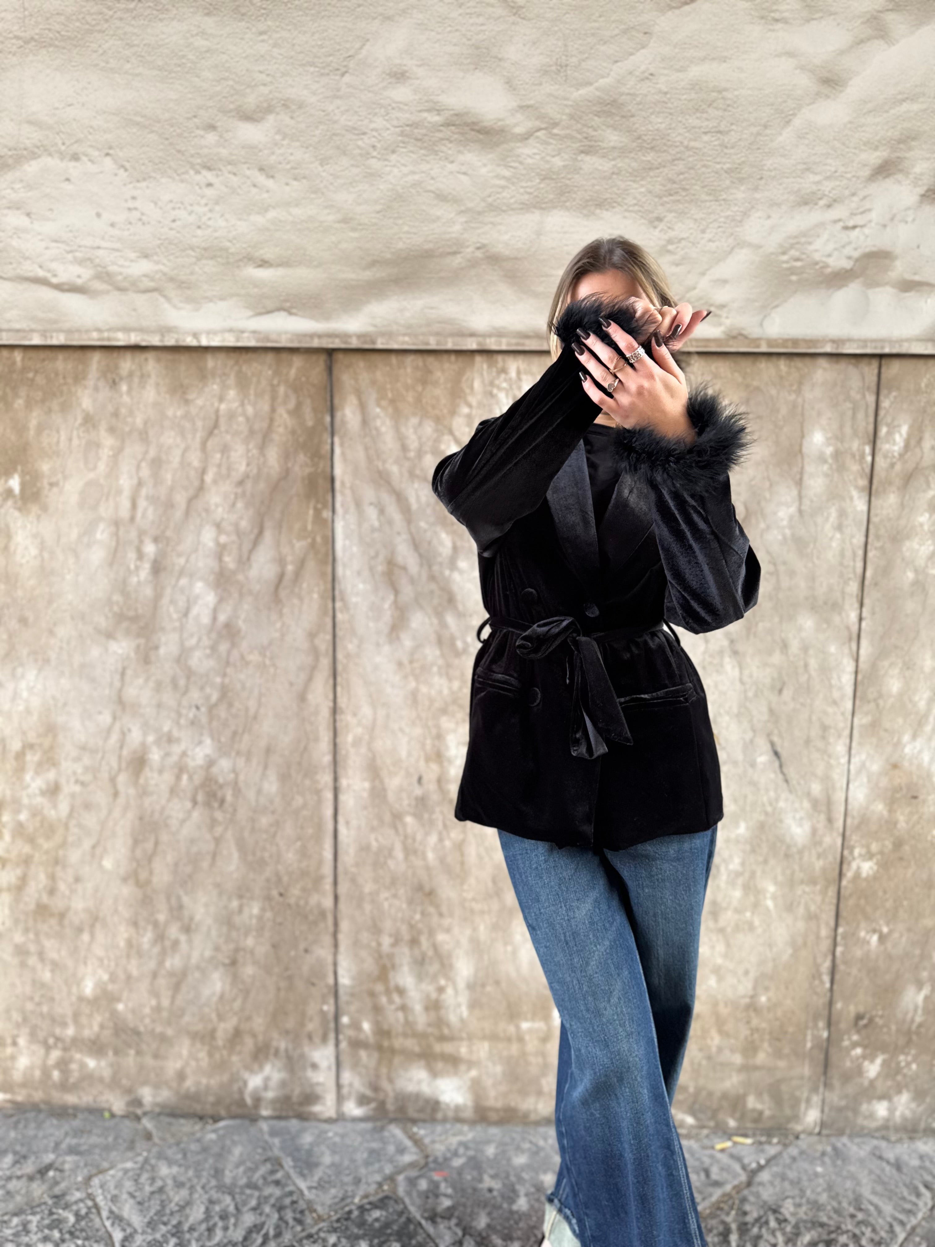 Questa giacca in velluto, disponibile sia in nero che in marrone, unisce eleganza e carattere in un unico capo scenografico.