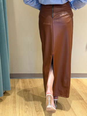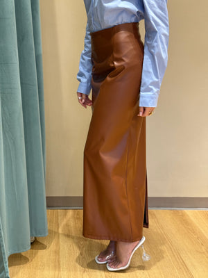 La Gonna Longuette Sara, in ecopelle avvitata, valorizza la figura con una vestibilità che si adatta dalla S alla L.