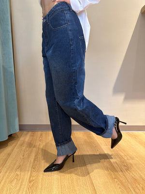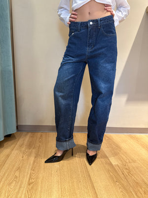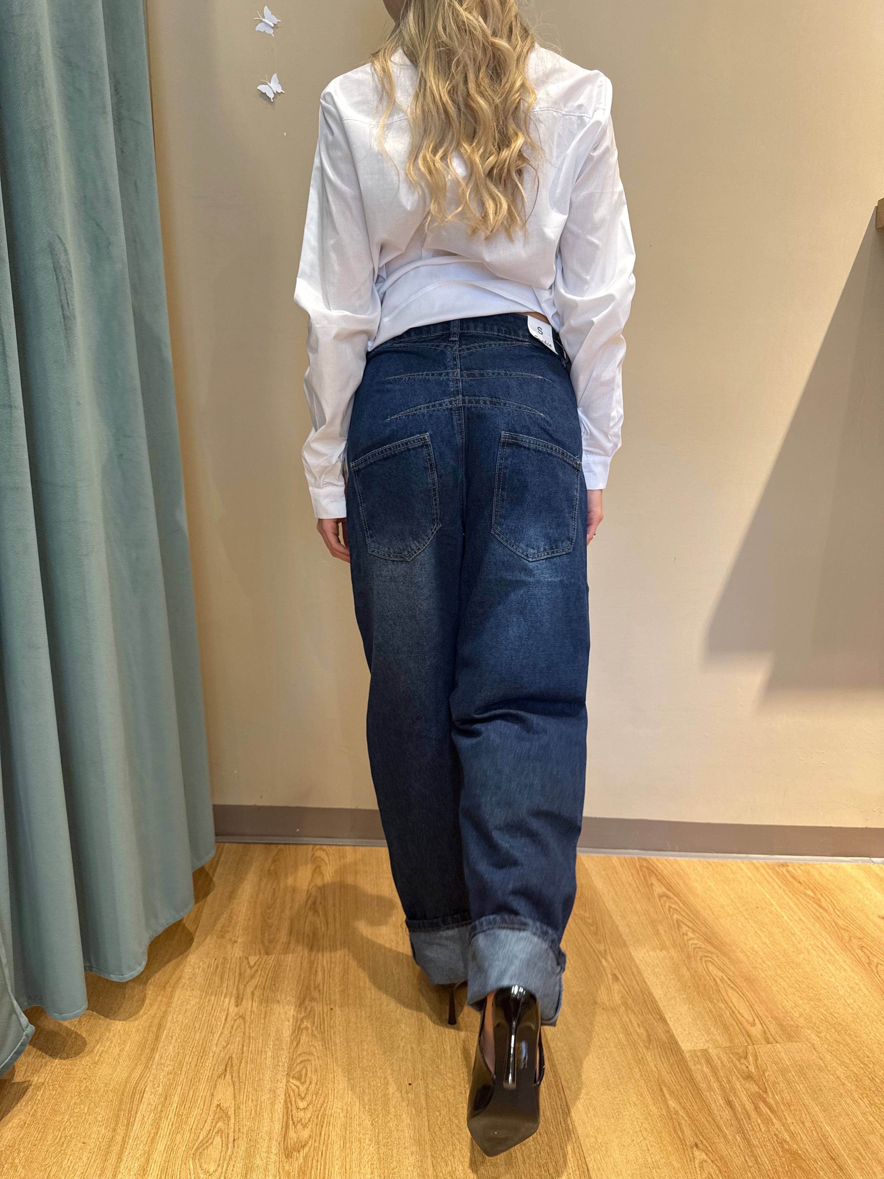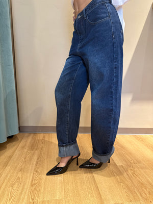 Realizzato in denim di alta qualità con lavaggio blu scuro uniforme, unisce comfort e carattere in un’unica silhouette impeccabile.