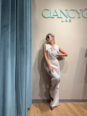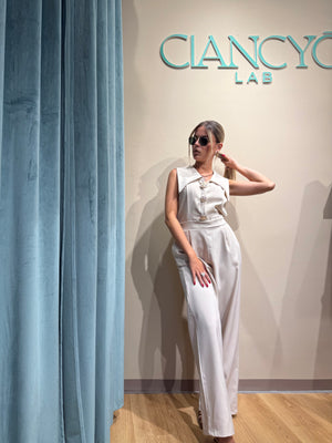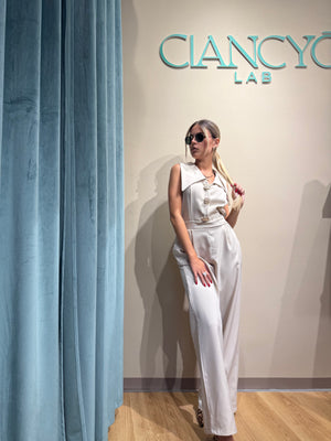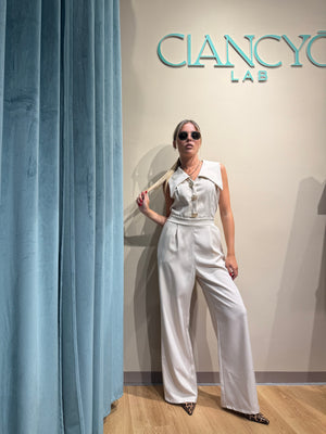 Unisce eleganza e comodità la tuta Jumpsuite Amelie con dettagli gioiello sullo scollo centrale e scollo a V spettacolare.