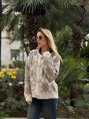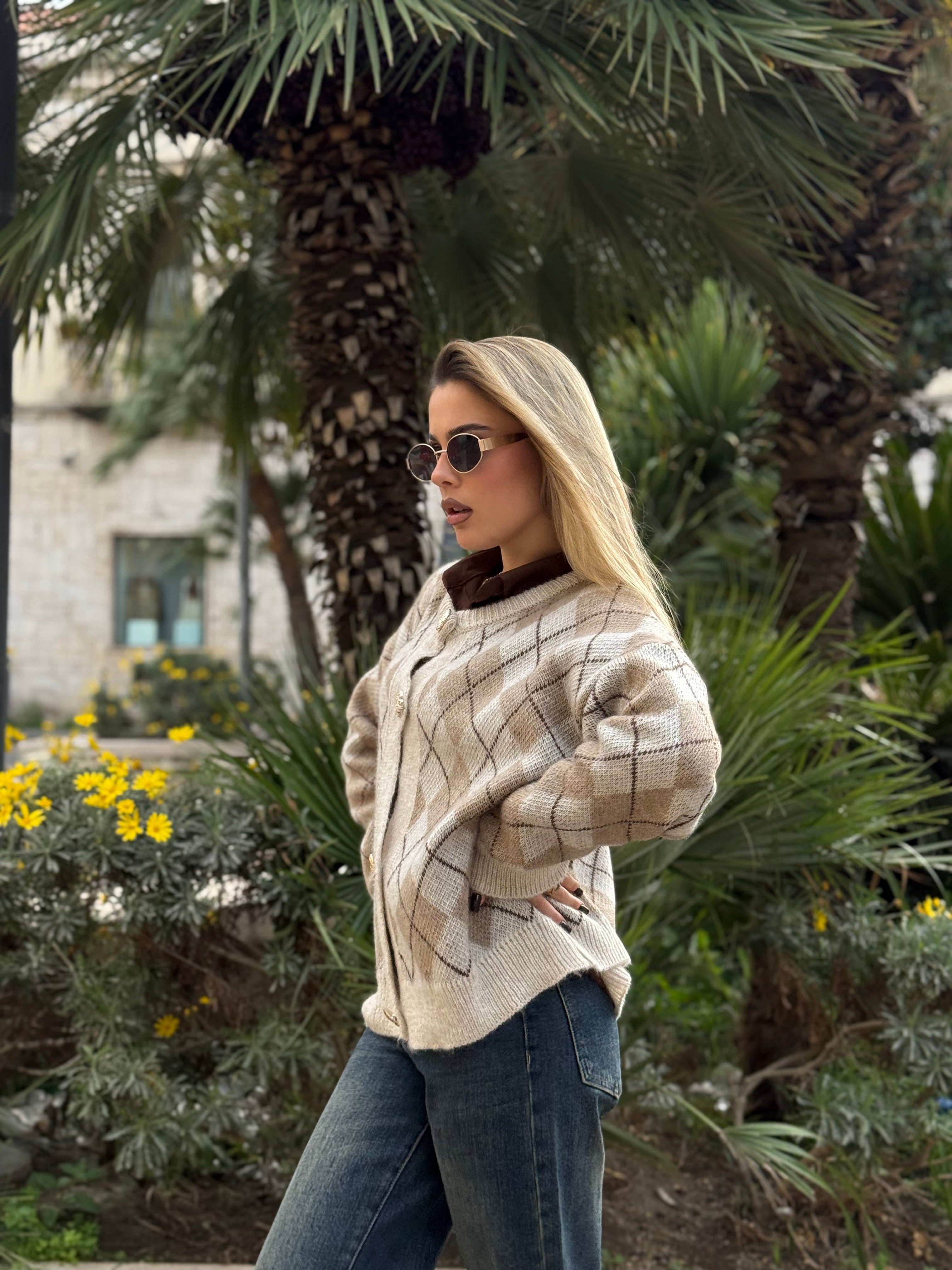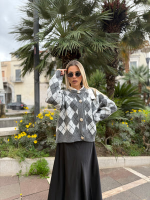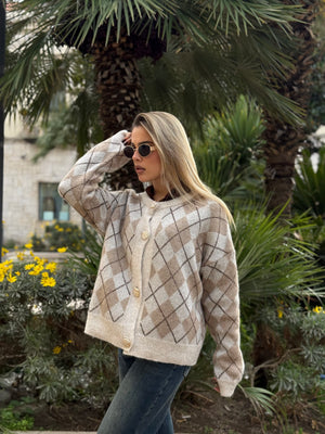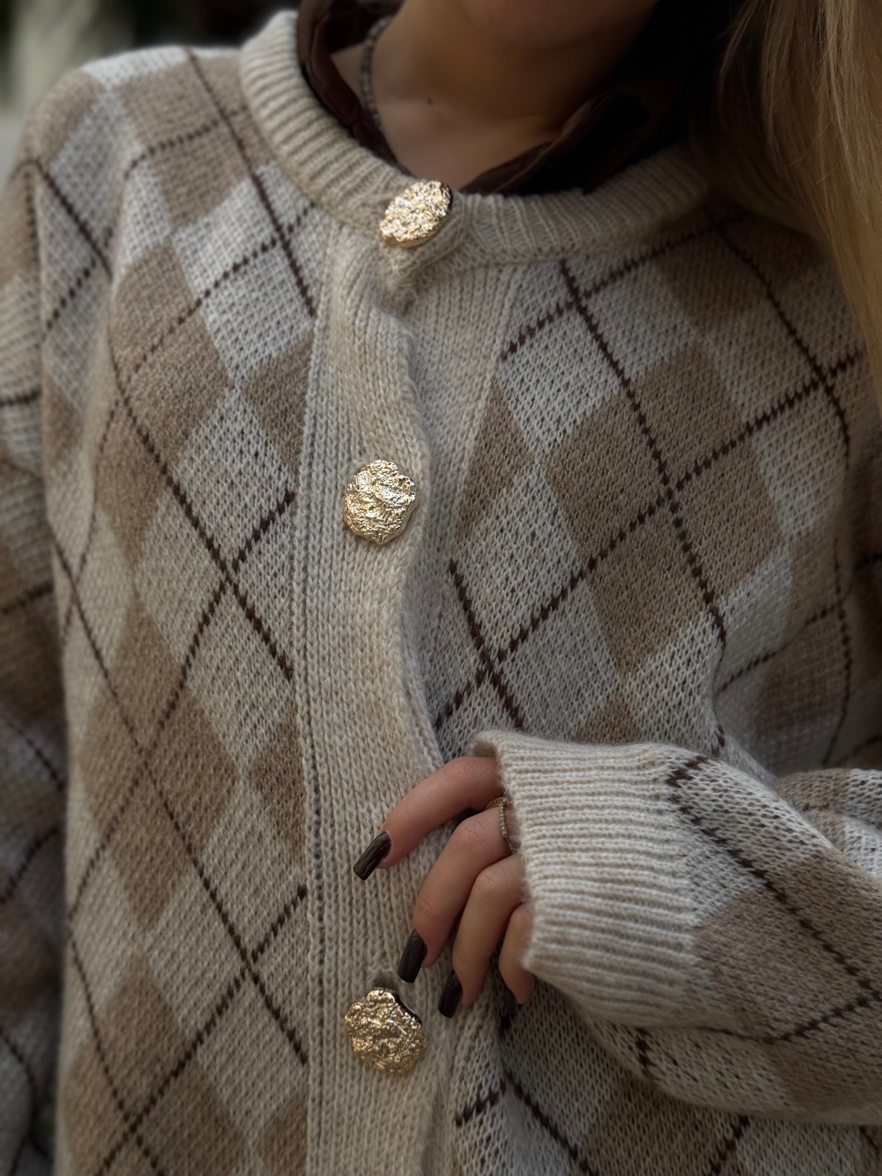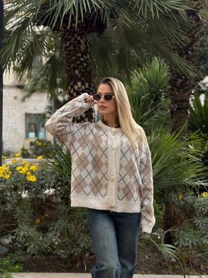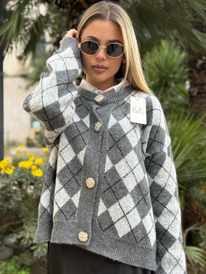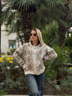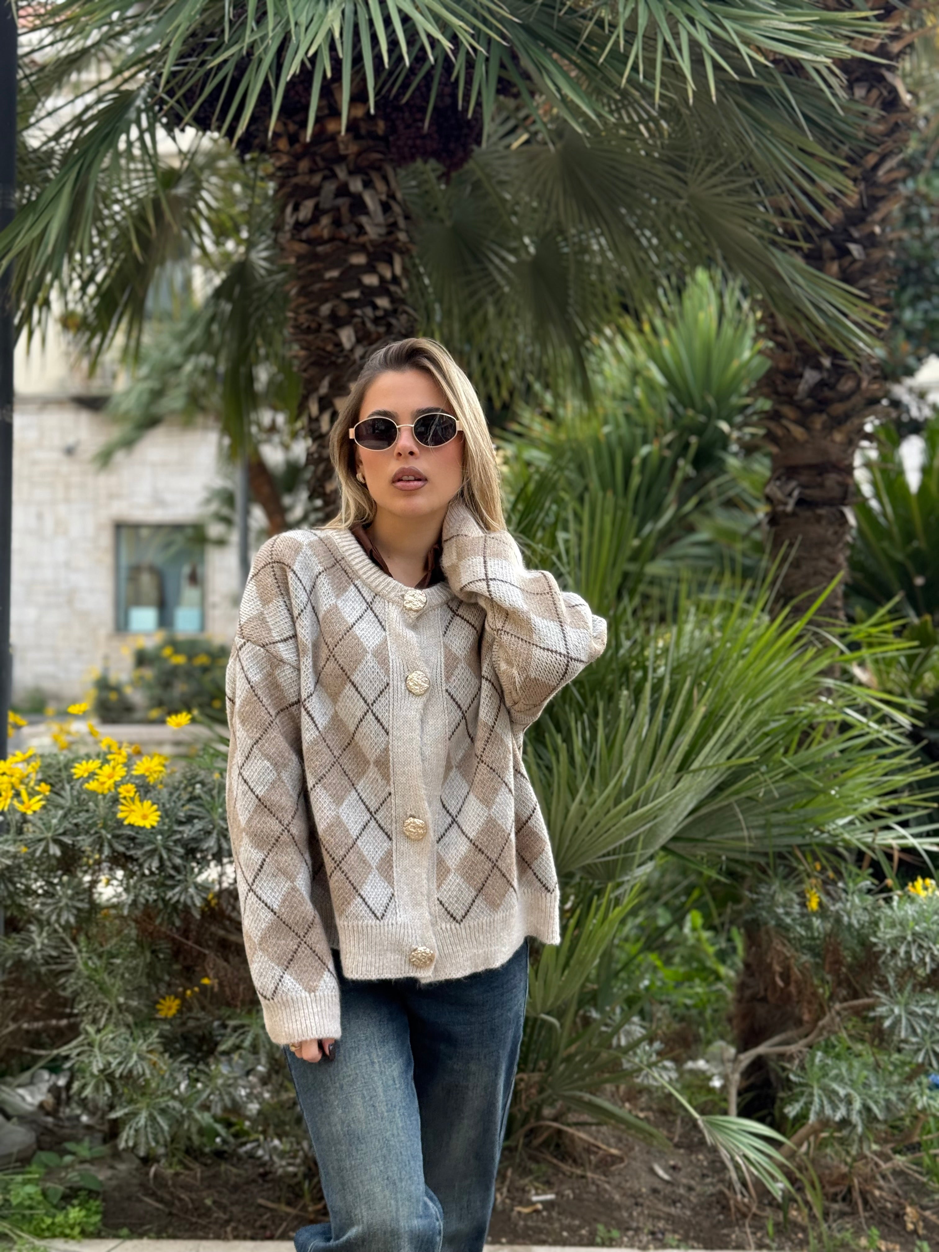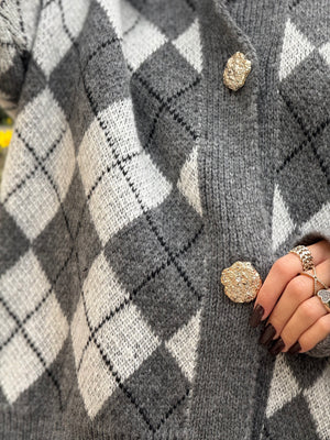 Un capo iconico e versatile, questo cardigan in lana con motivo a rombi è pensato per chi non vuole passare inosservata.