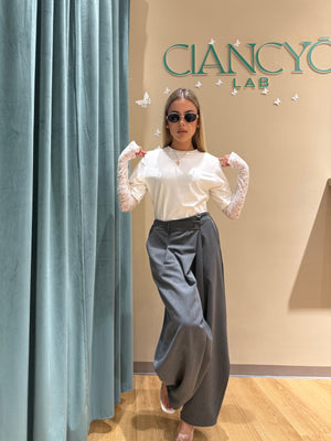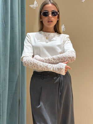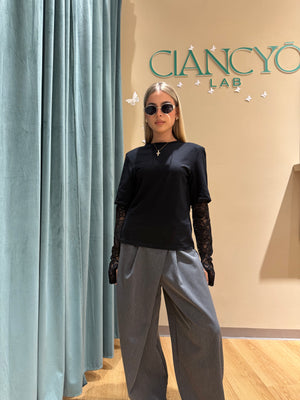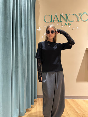 Questa maglia unisce la morbidezza del 100% cotone a un dettaglio in pizzo elegante sulle maniche, donando un tocco sofisticato a qualsiasi outfit.