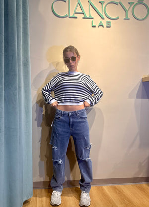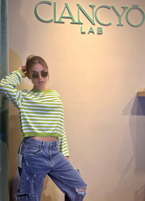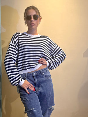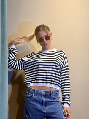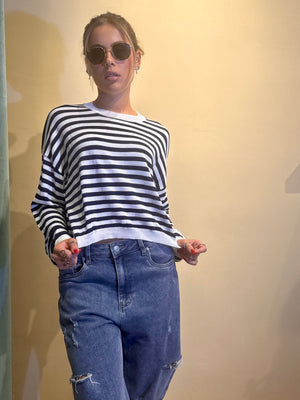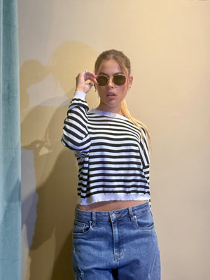 La Maglia Tonia a strisce in filo unisce leggerezza e stile, grazie a una lavorazione artigianale che valorizza ogni dettaglio.