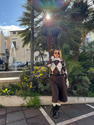 Un capo iconico e versatile, questo pull in lana con motivo a rombi è perfetto per chi ama distinguersi con stile.