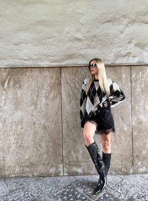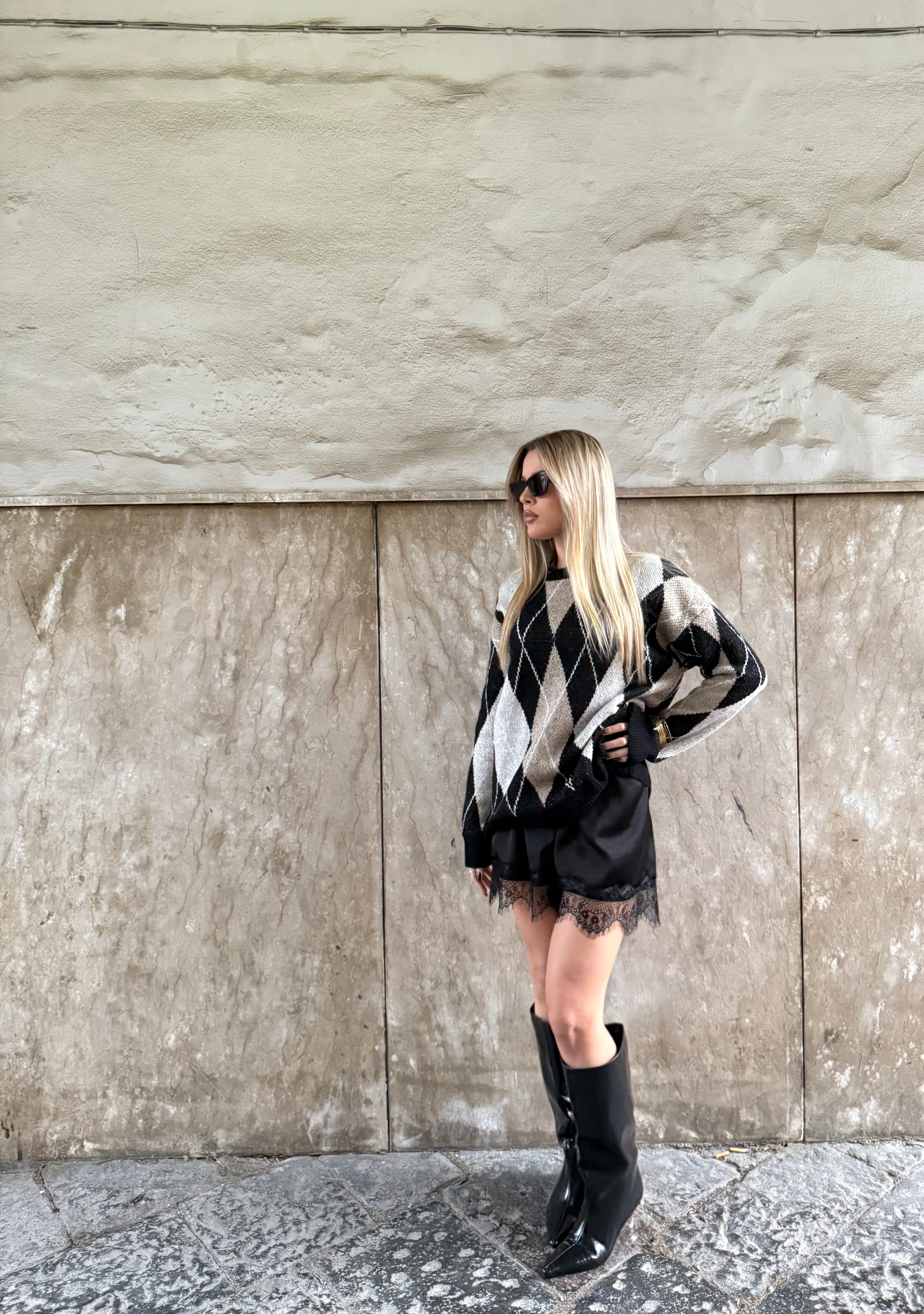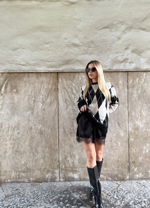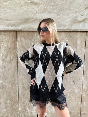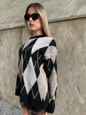 Un capo iconico e versatile, questo pull in lana con motivo a rombi è perfetto per chi ama distinguersi con stile.