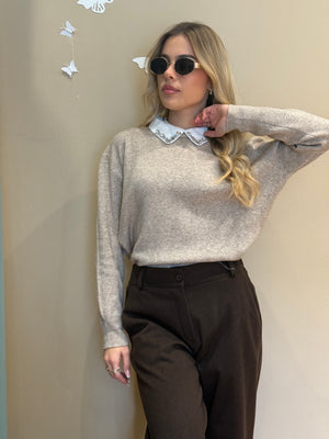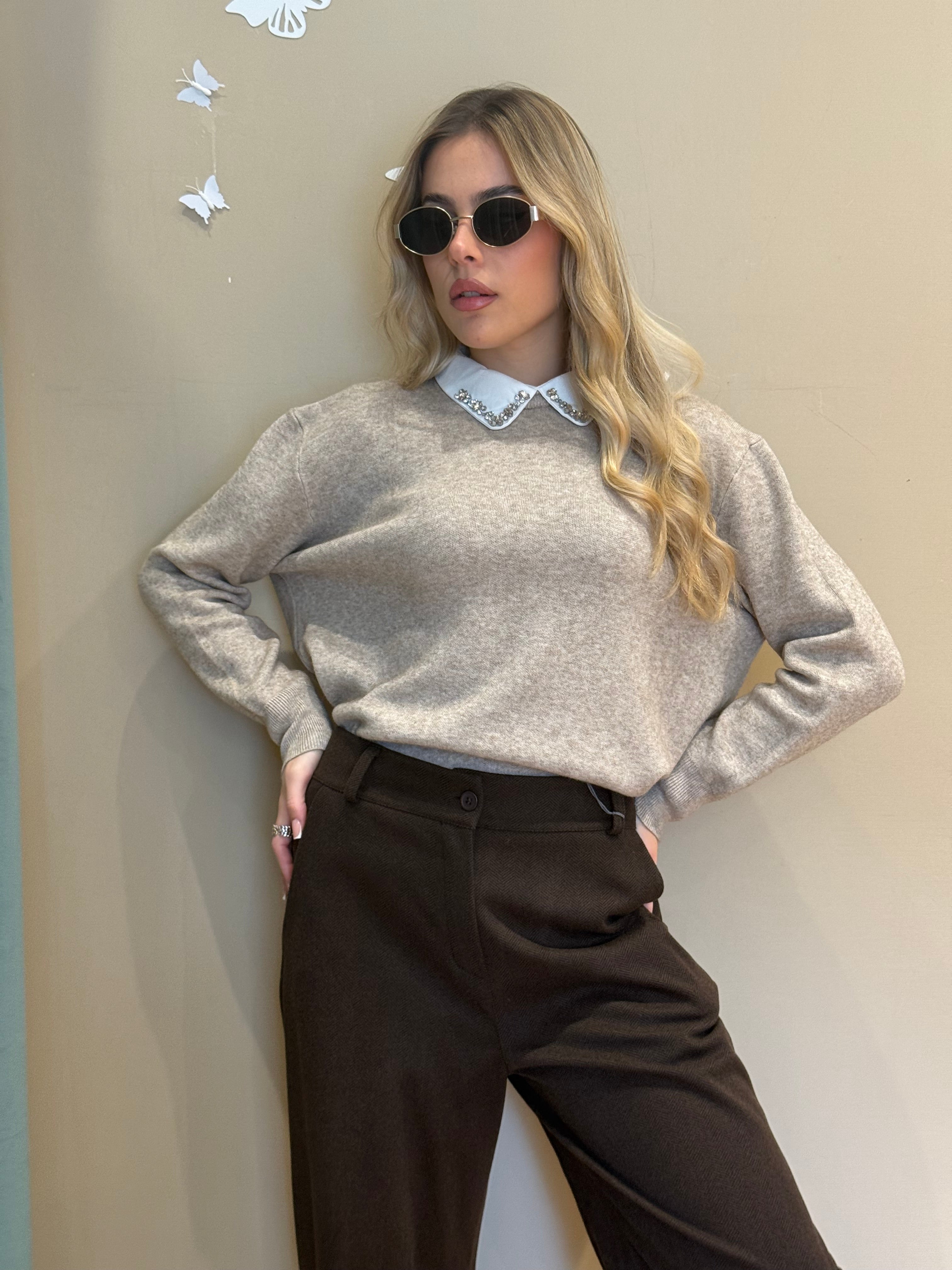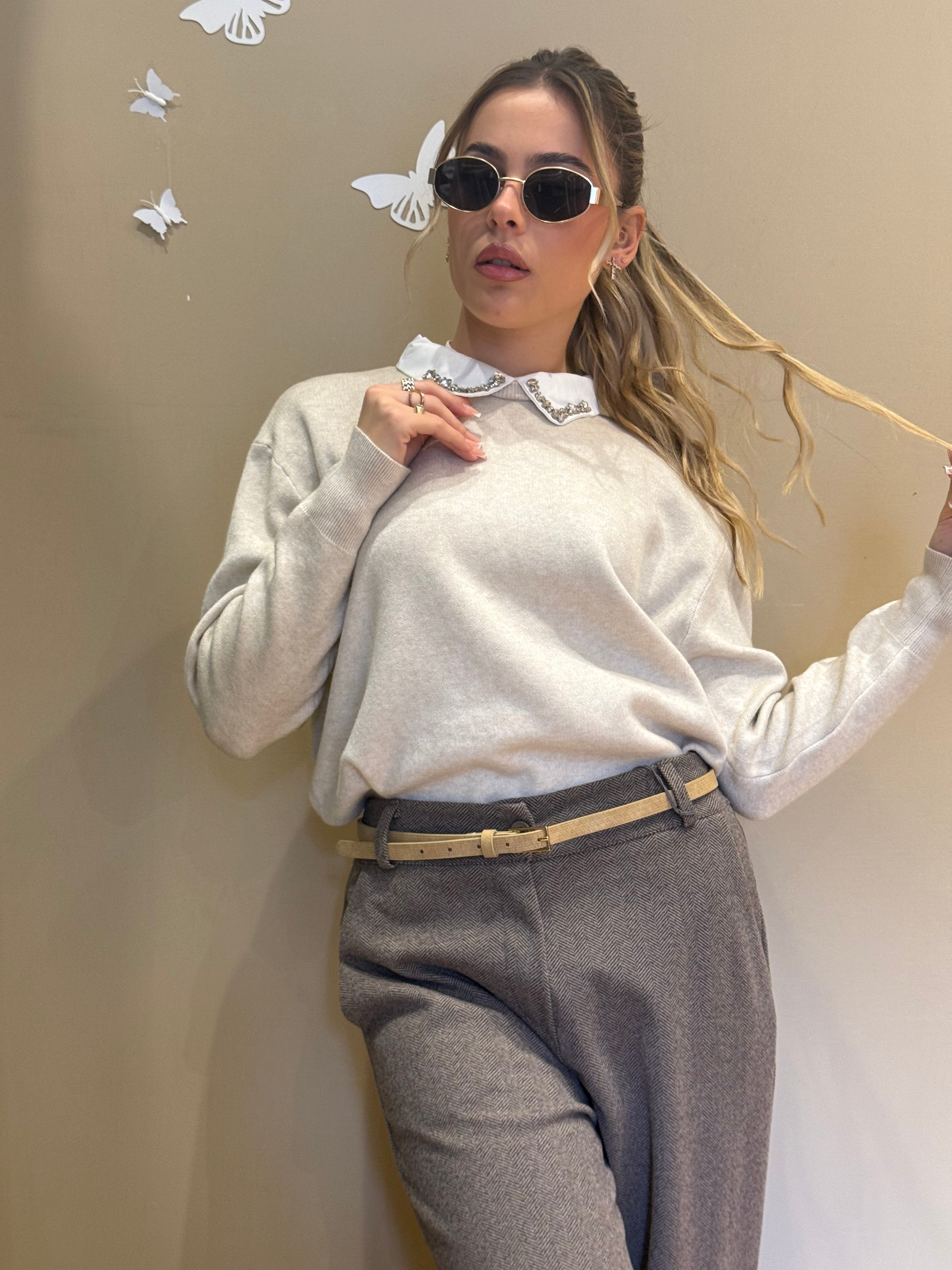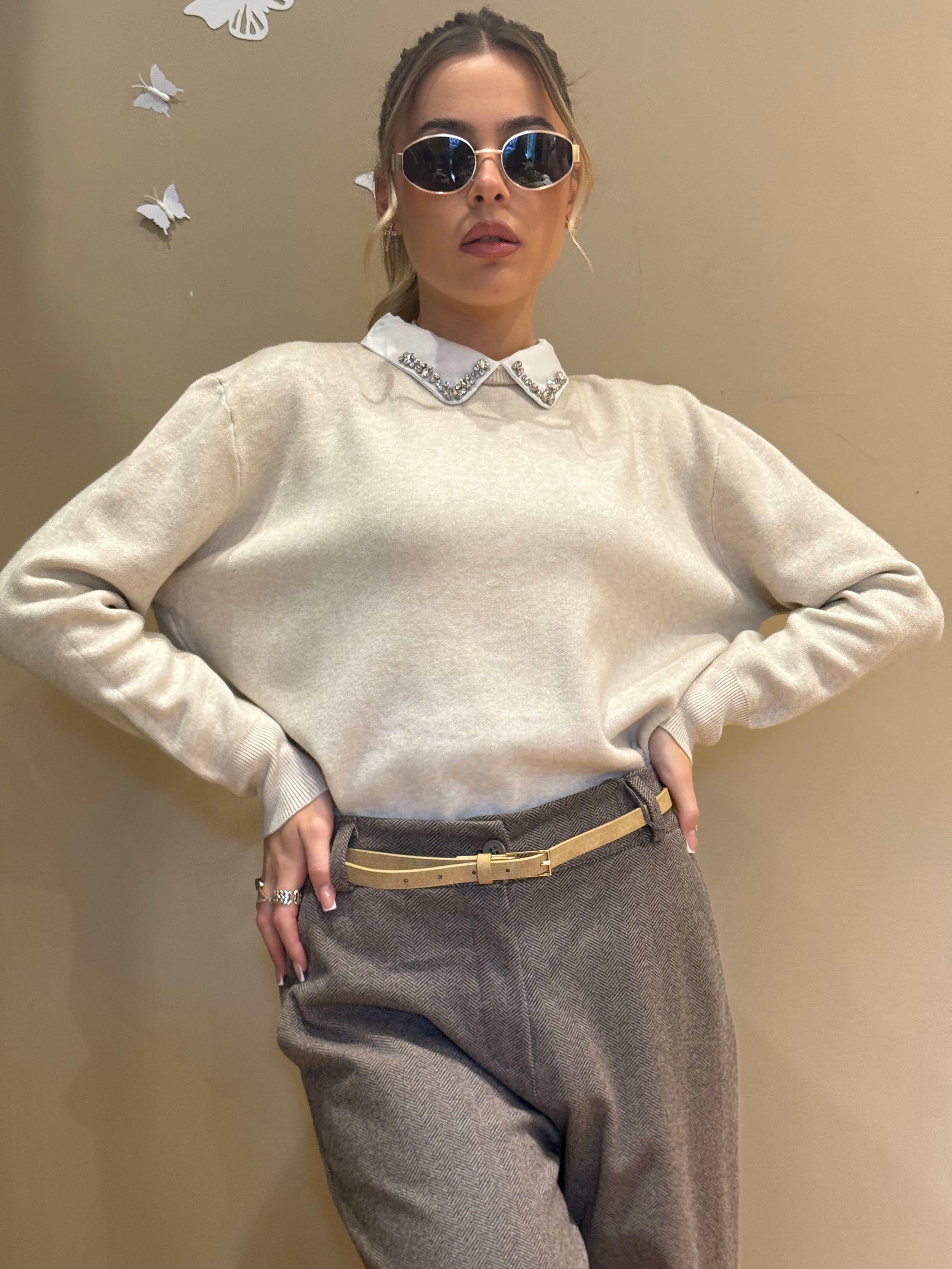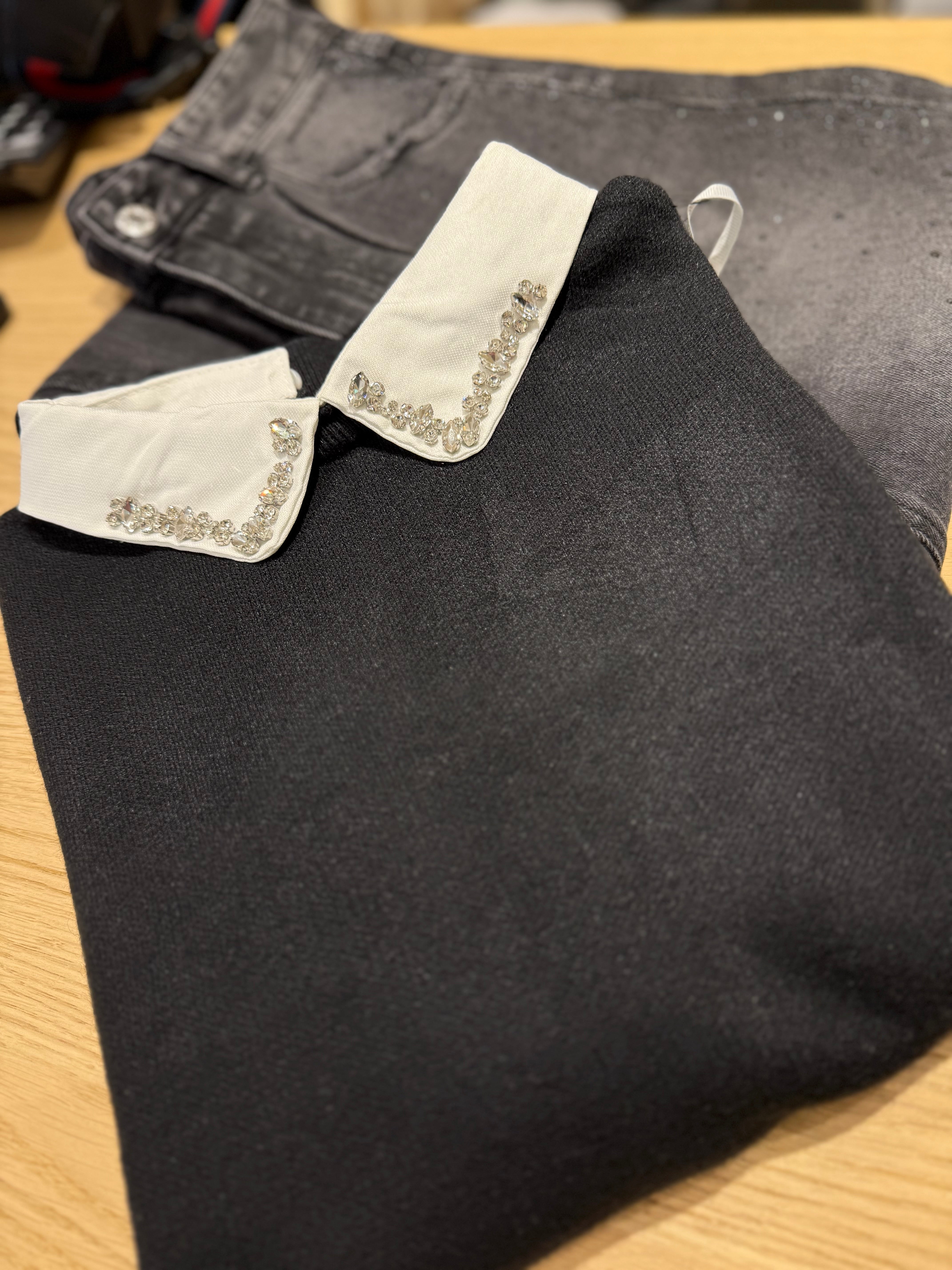 Il colletto bianco con applicazioni gioiello illumina il viso e aggiunge eleganza al look, rendendolo ideale sia per outfit casual chic che per occasioni più ricercate.