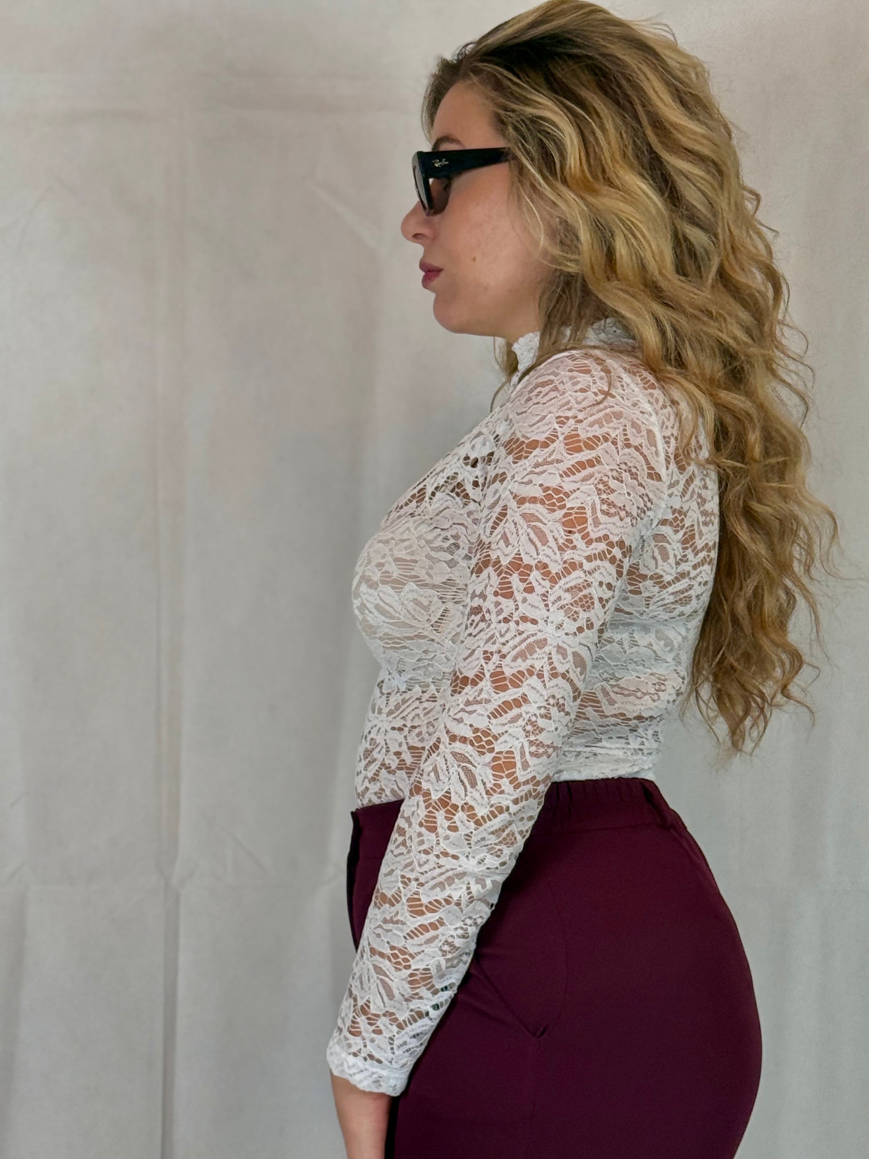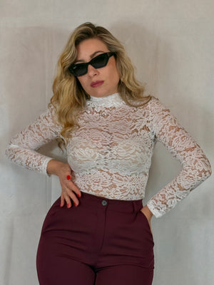 Body in pizzo effetto vedo-non-vedo, completamente realizzato in pizzo lavorato per un look sensuale ma elegante. Il mezzo collo valorizza il décolleté e dona subito carattere all’outfit.