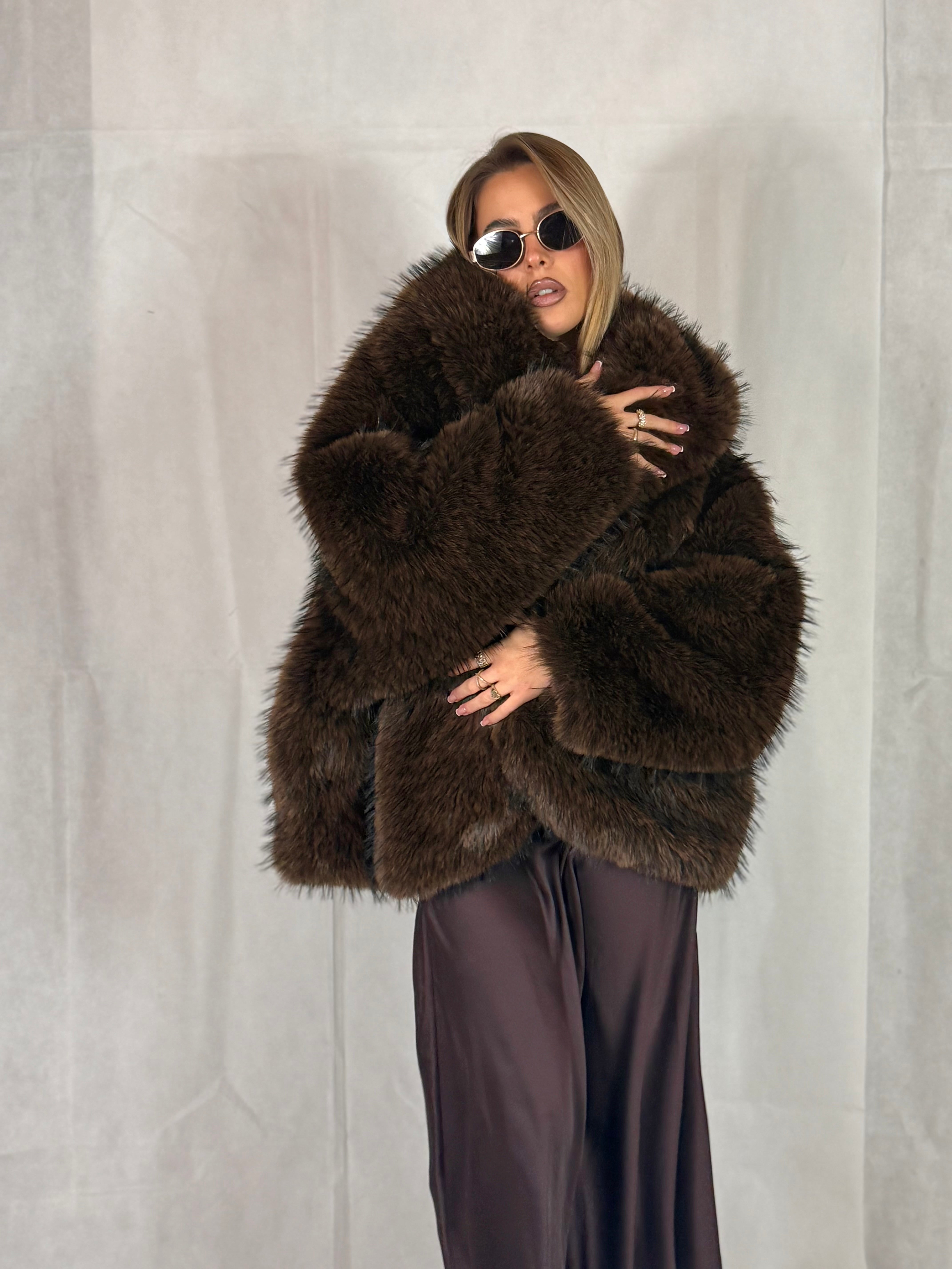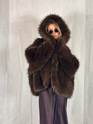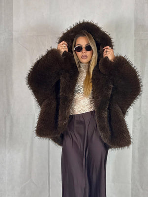 Il mood visone, arricchito da delicati richiami al nero, conferisce un effetto sofisticato e prezioso, mentre il pelo ecologico, folto e liscio, dona movimento e un allure di lusso senza rinunciare all’eticità.