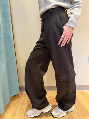 Realizzato in tessuto fluido ma strutturato, presenta tasconi bassi laterali e laccio regolabile alle caviglie, per adattare la vestibilità secondo lo stile desiderato.