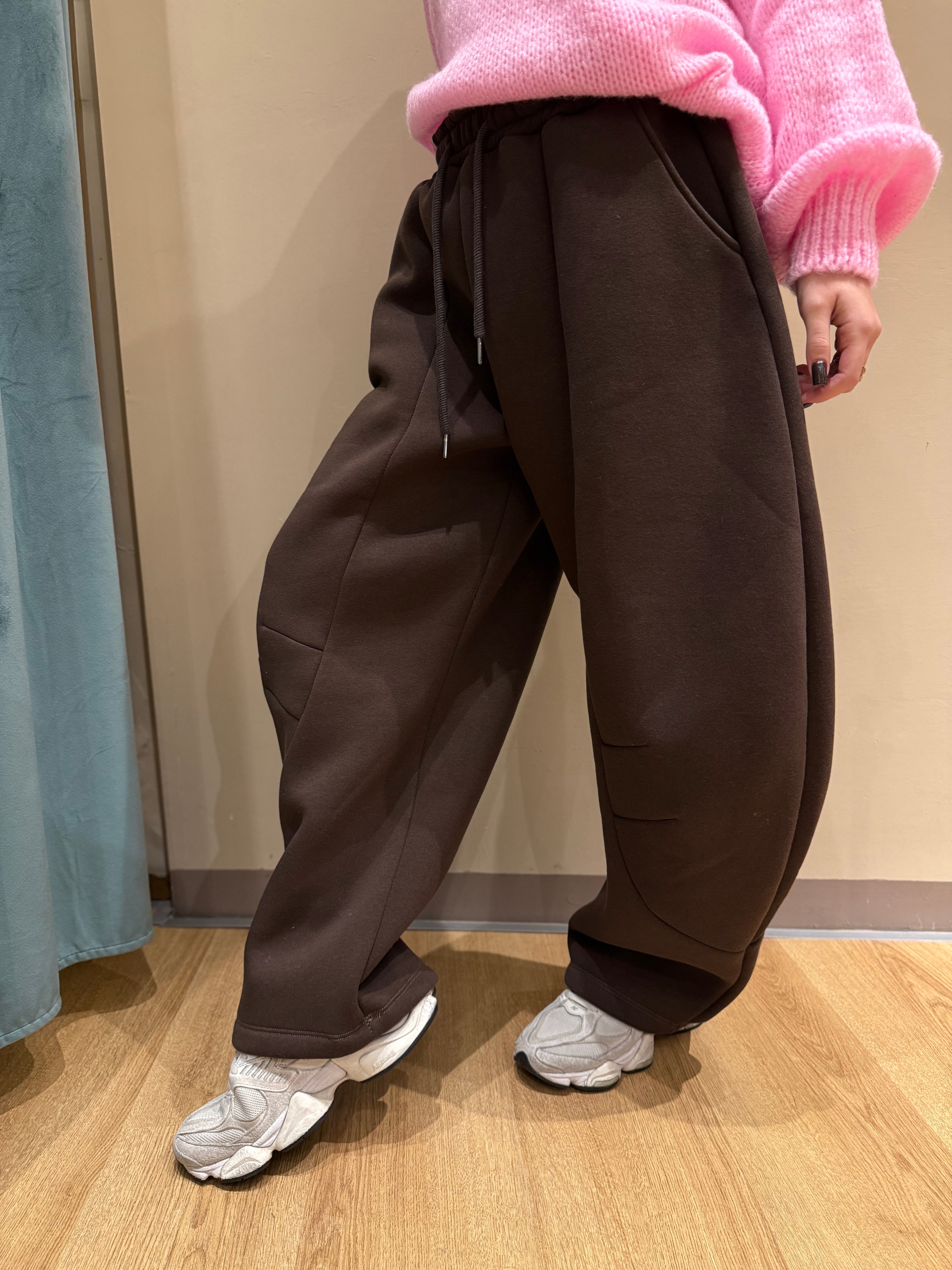 Realizzato in un tessuto felpato e piacevole al tatto, presenta una vita elastica che assicura una vestibilità comoda e adattabile, mentre la gamba arrotondata e generosa dona un look trendy e rilassato.