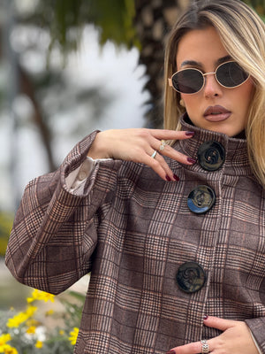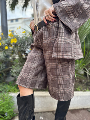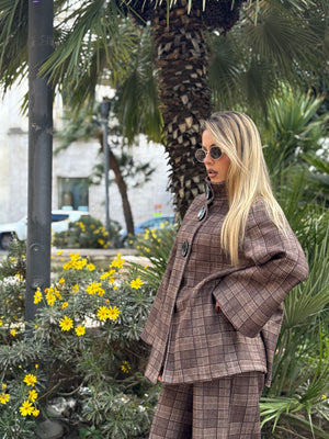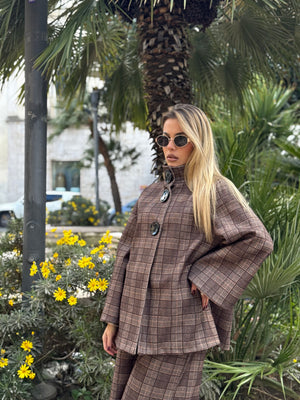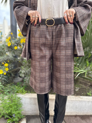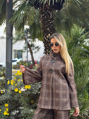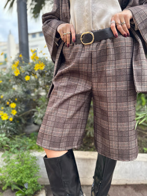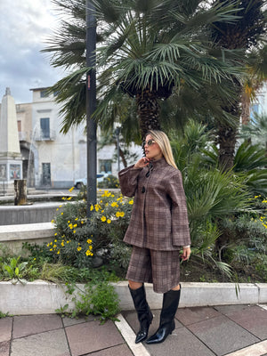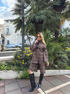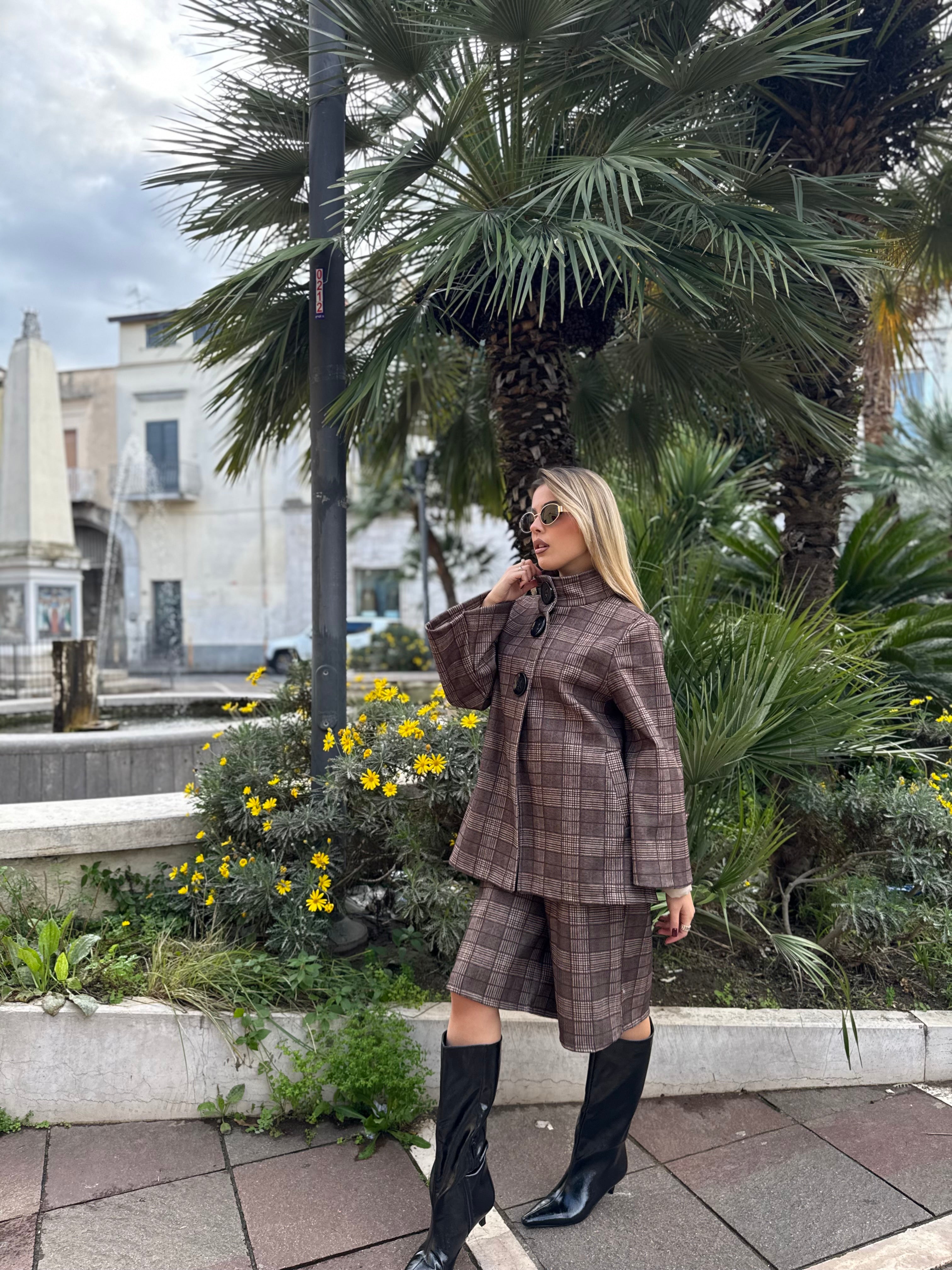 La giacca dalla linea pulita si abbina al maxi bermuda nello stesso motivo check, creando un look armonioso, moderno e di grande impatto.