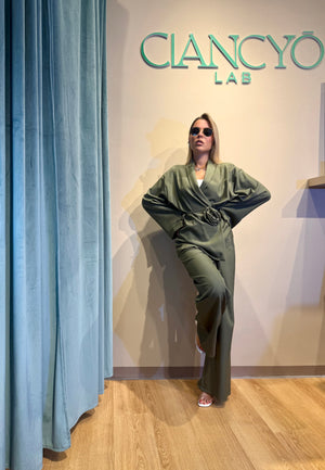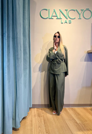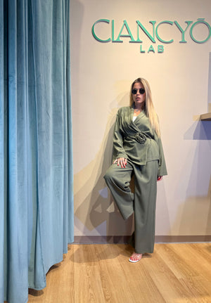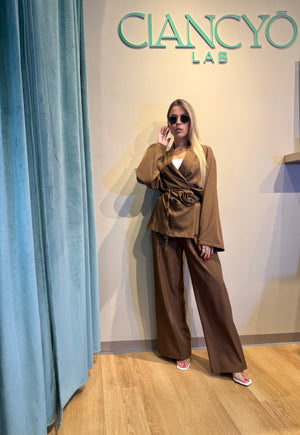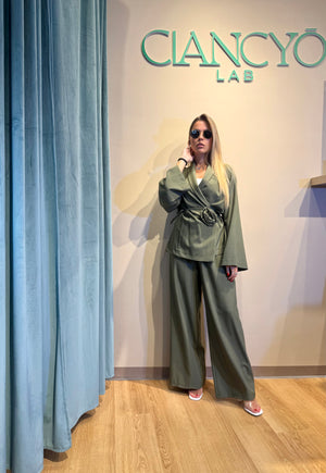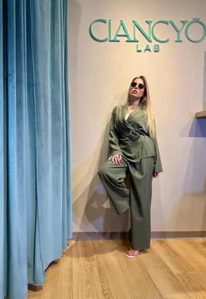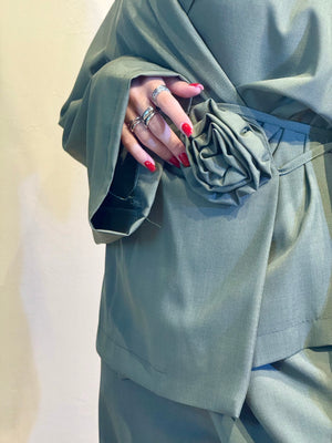 Il tailleur Flower unisce una giacca con cinturino in vita impreziosito da un fiore fisso a pantaloni palazzo ampi e fluidi.