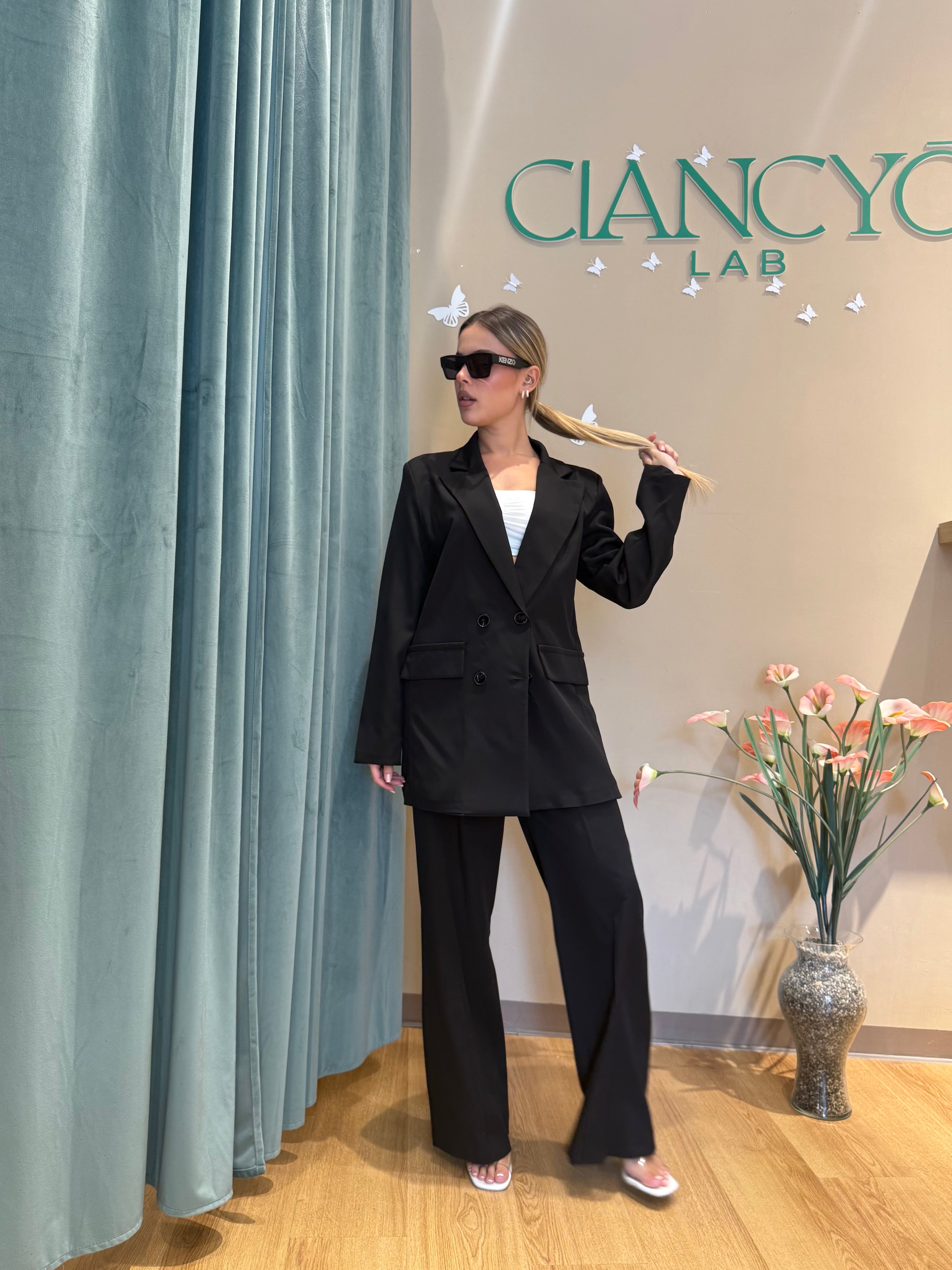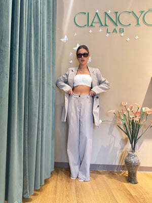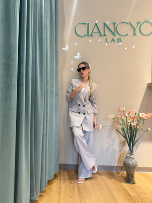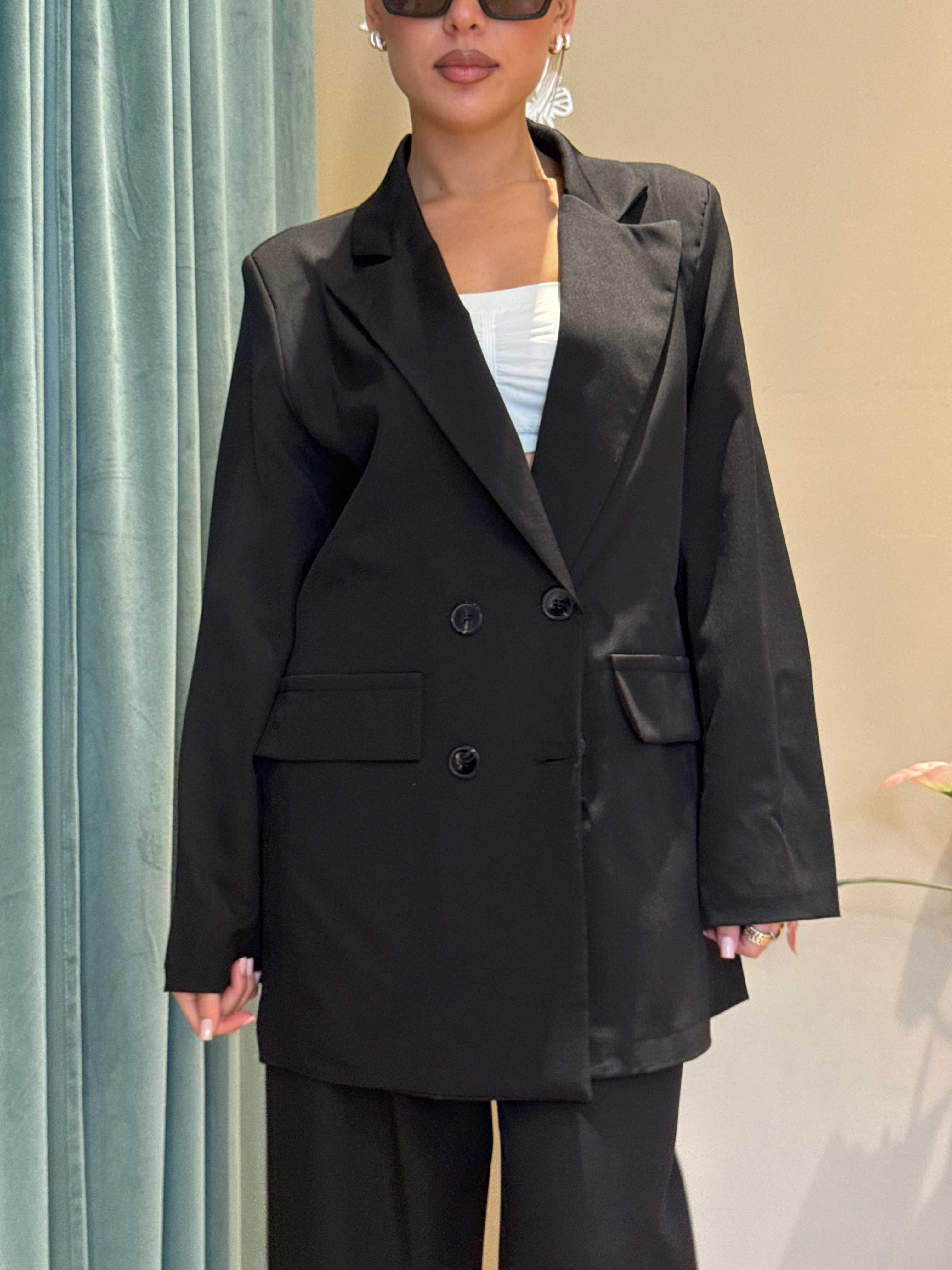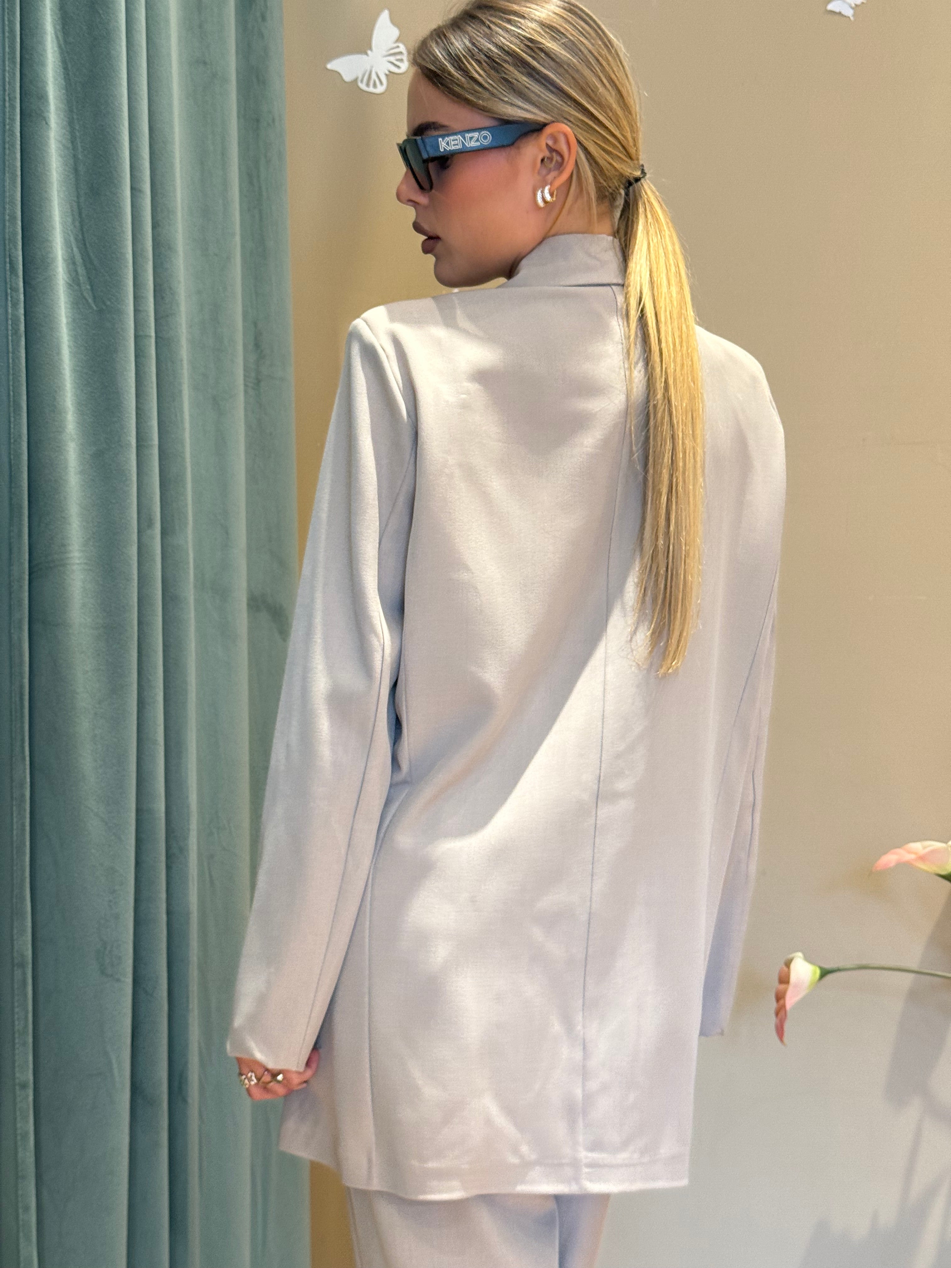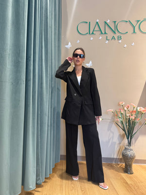 Il tailleur Simona, con giacca doppiopetto oversize, unisce eleganza e versatilità.