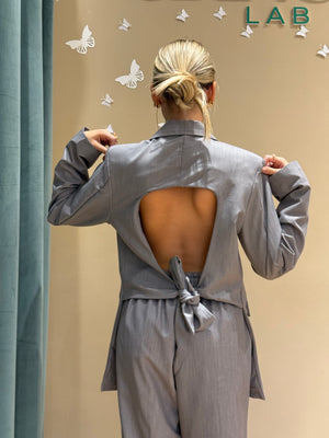 Il Tailleur Stefania unisce eleganza e modernità, con una abbottonatura frontale raffinata e una mezza schiena scoperta impreziosita da un delicato fiocco.