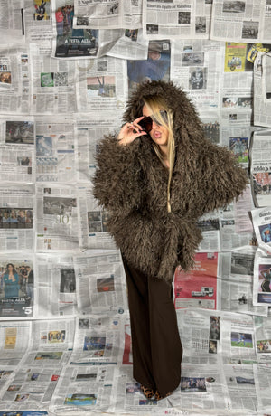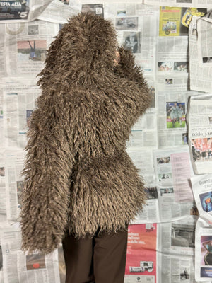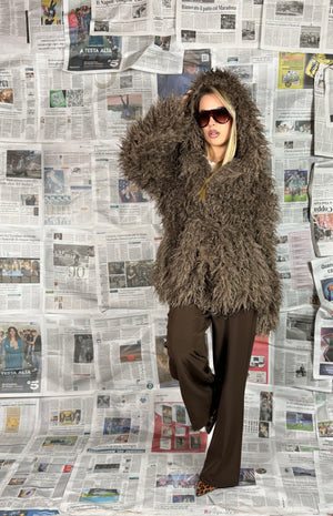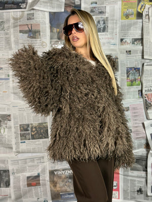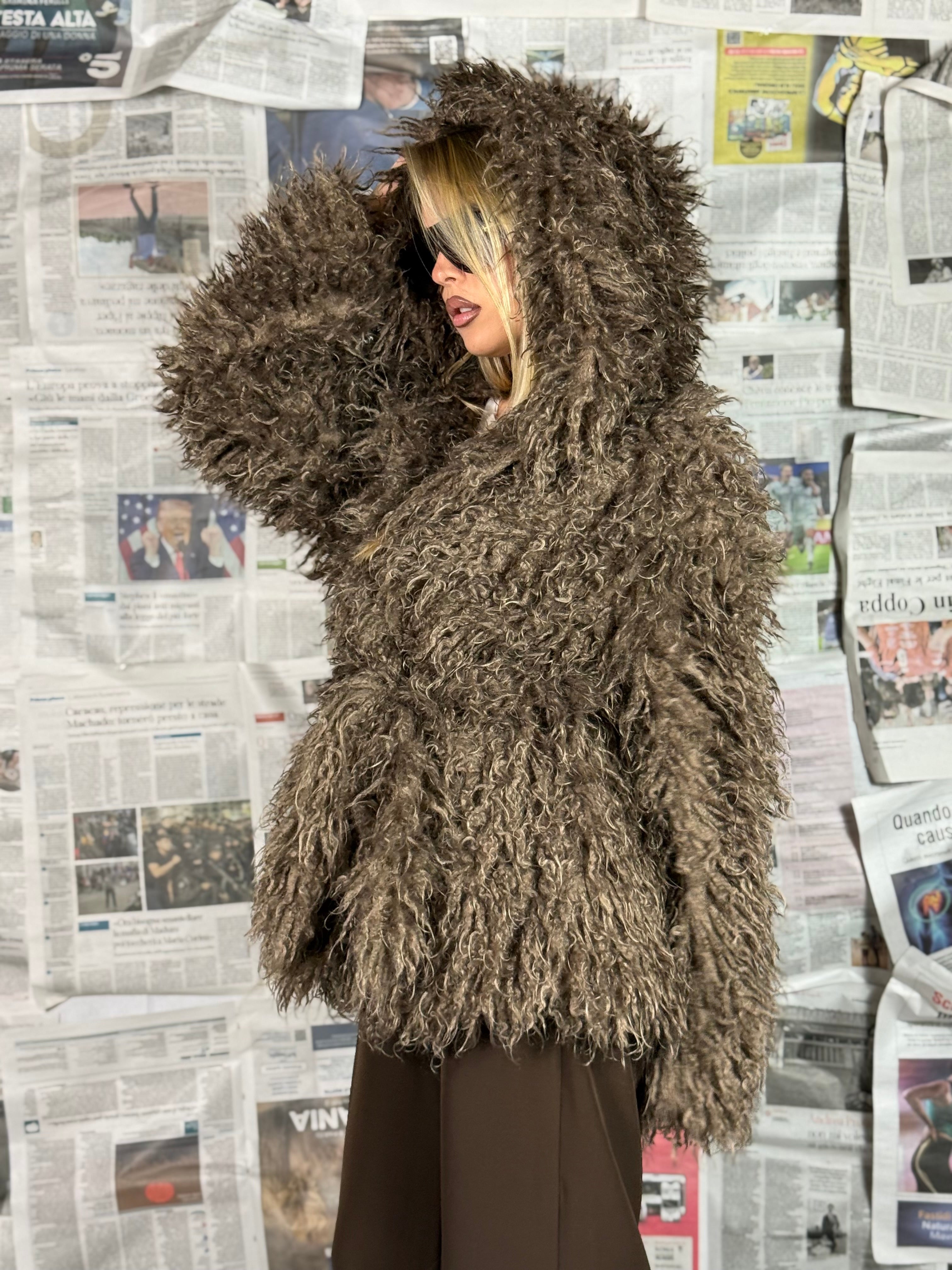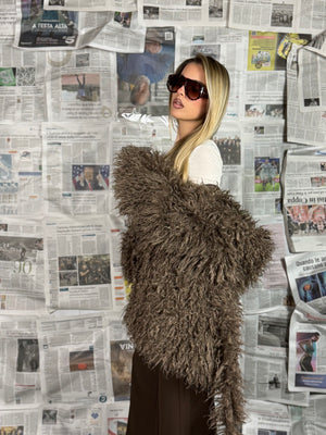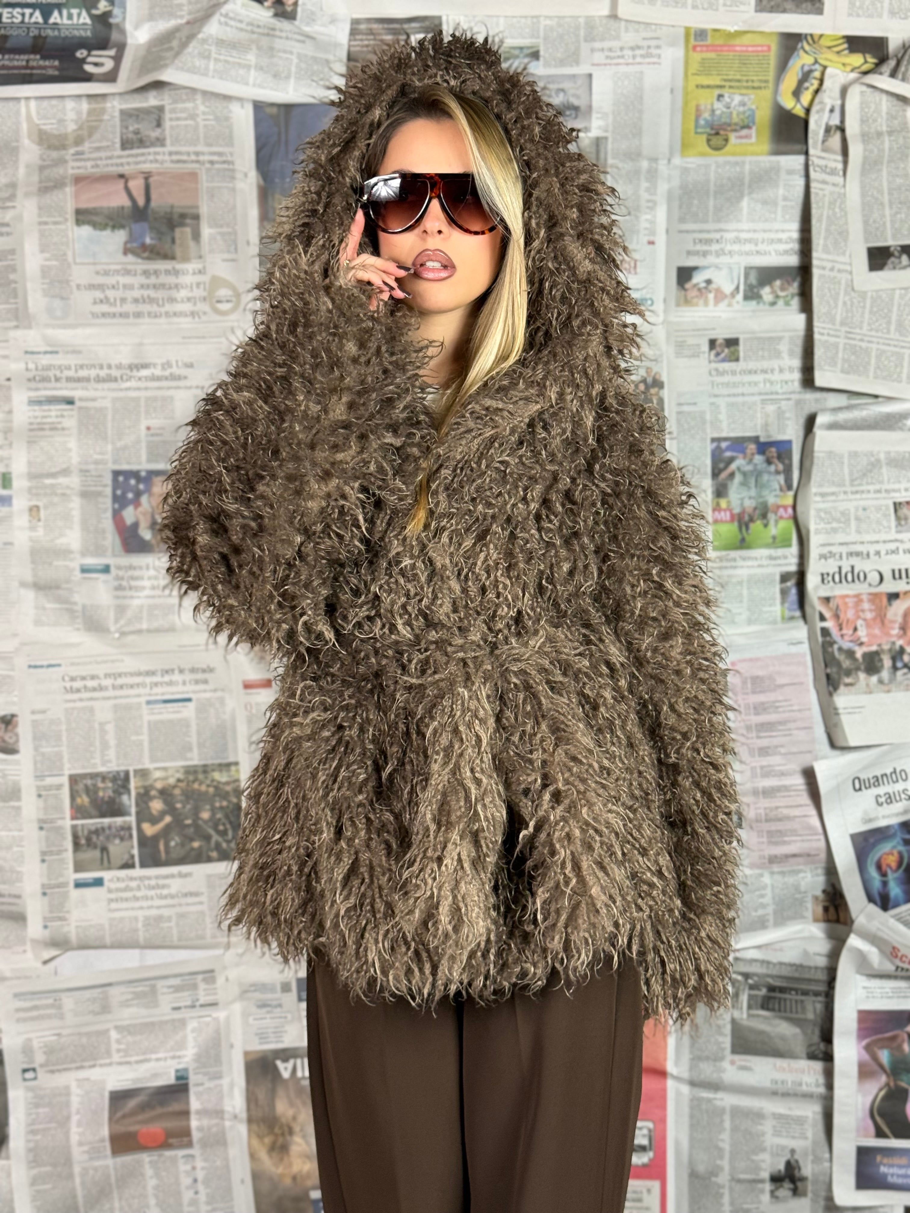 La lavorazione effetto pelliccia dona volume e movimento, rendendolo caldo e avvolgente senza rinunciare allo stile.