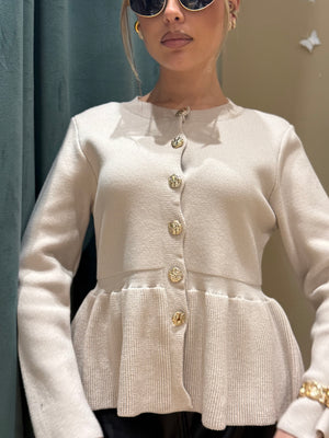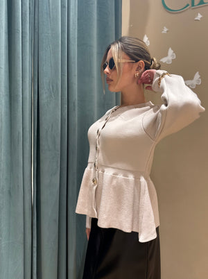 La particolarità è la costruzione del volume: il cardigan si stringe delicatamente in vita per valorizzare il punto vita e poi scende con un raffinato effetto palloncino, creando una silhouette femminile e armoniosa.